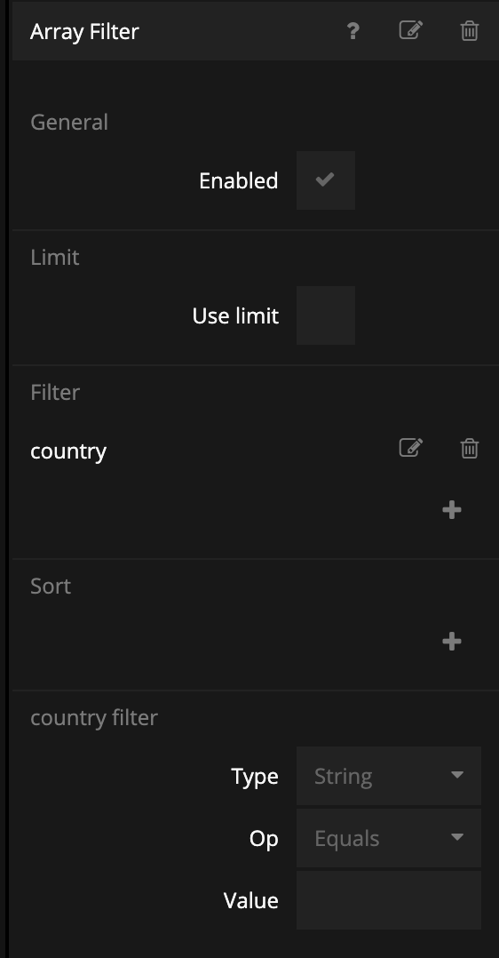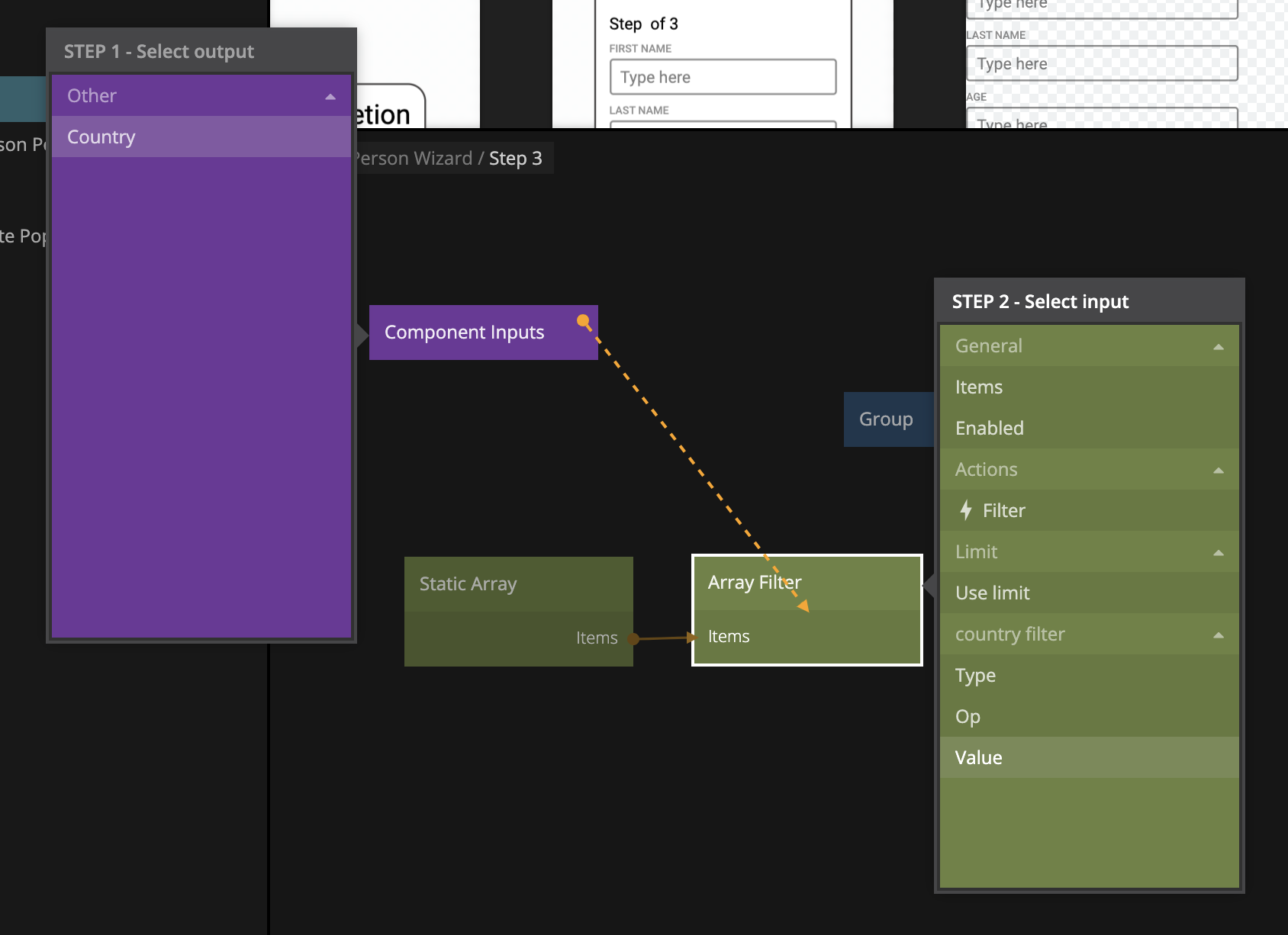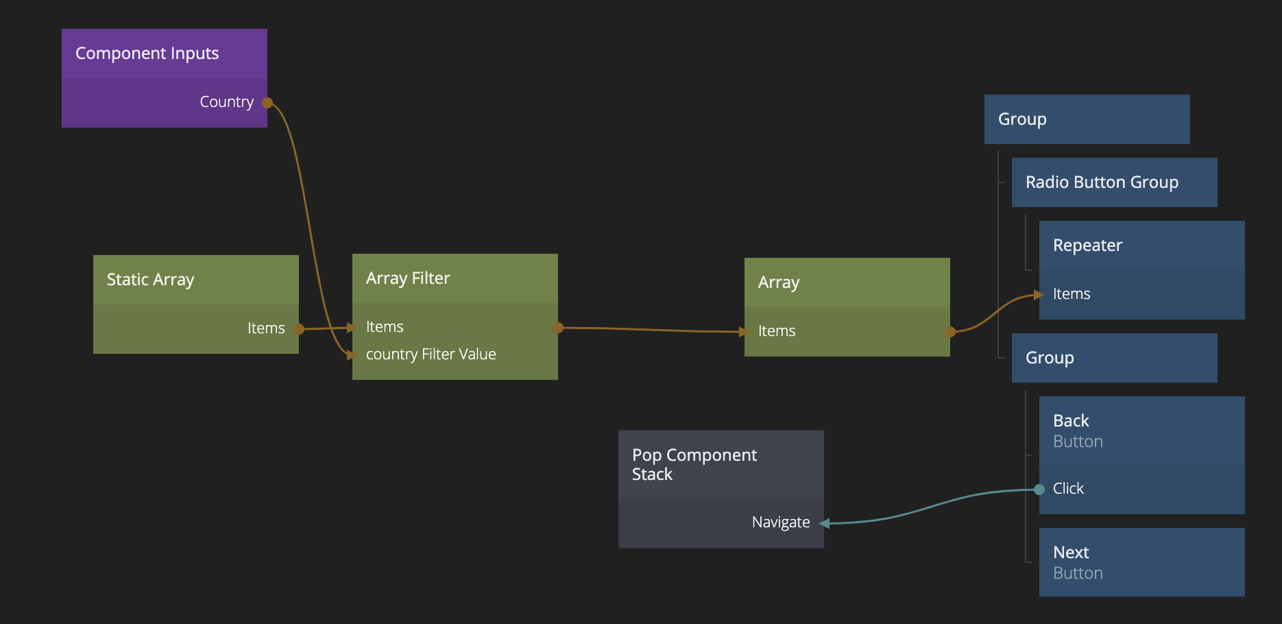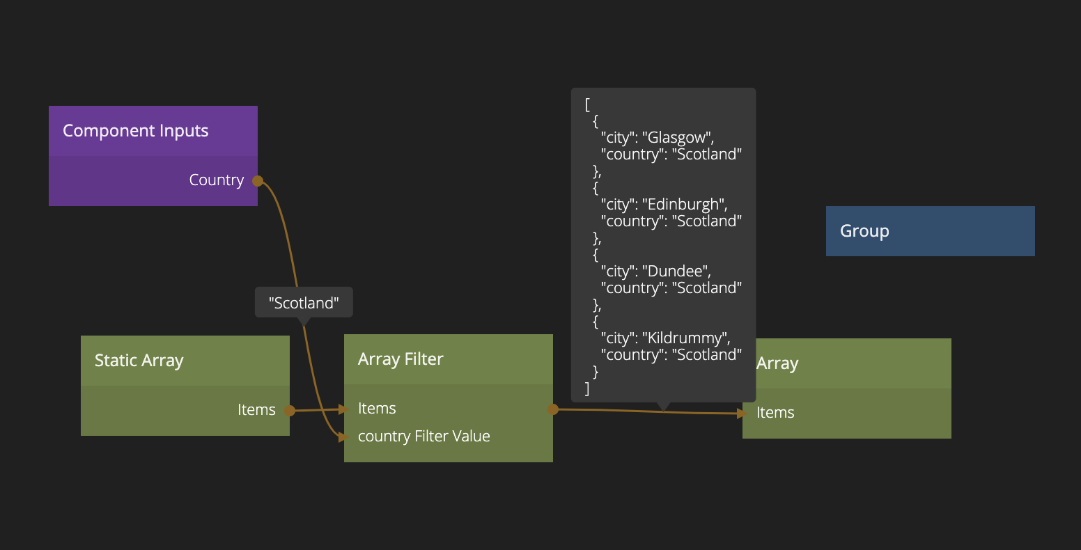 Then connect Items of the Static Array to the Items of the Array Filter. Then connect the country output of the Component Inputs to the Value of the country filter.