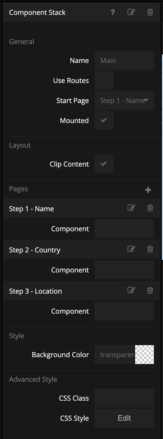 They are an alternative navigation component compared to the Page Router and related nodes. Instead of giving each Page a URL, and making use if the browser back history, Component Stack is completely handled from within the App. Both these styles of navigations can of course be combined. In this guide we will combine Component Stack with Popups. You will learn how to make a little modal wizard.