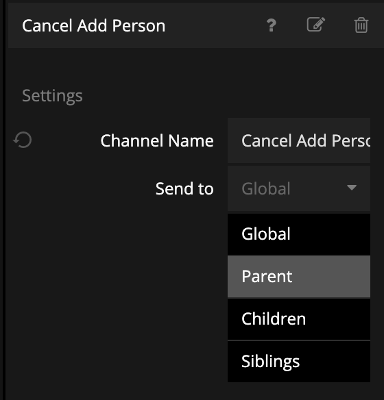 So add a Send Event node and give the channel name Cancel Add Person. Make sure it's only directed towards the parent.