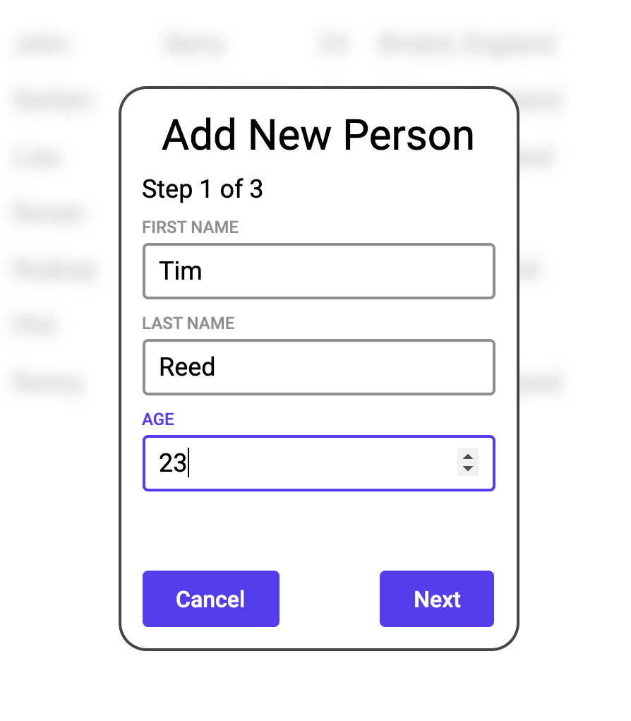 We now want to do a wizard style Popup were the user can add more persons to our list of people. "Wizard style" meaning the user will move through multiple screens within the Popup to create the entry. Normally, navigation in Noodl is done using the Page Router node (check out the guide here), but this it typically not meant for modal states of the app, since each Page have a unique URL. Instead you can use the Component Stack node which doesn't affect the URL and therefore is more fit for a modal state in the app. It also supports transitions which is nice.