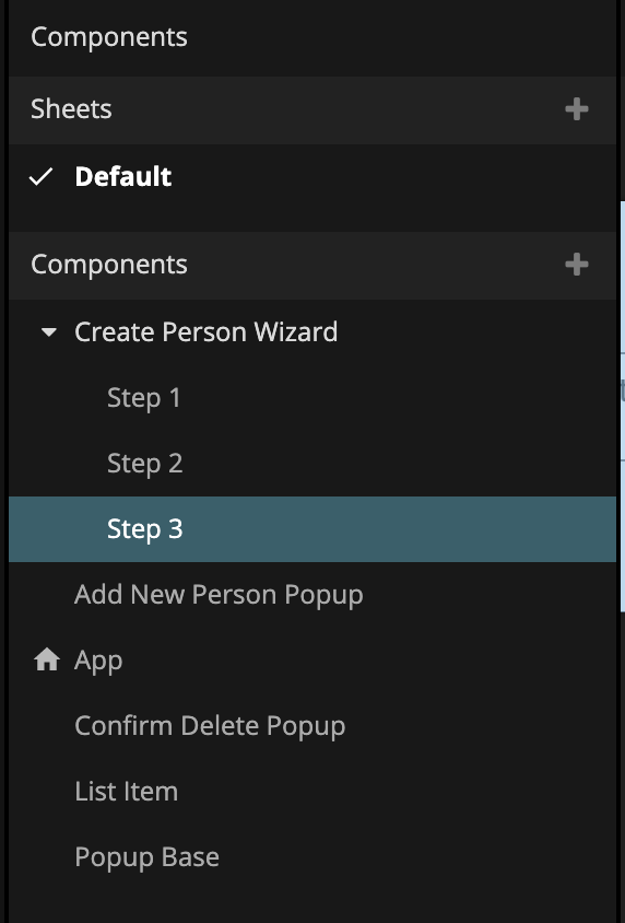 We are going to need to create components for each of these components. To keep better track of them we will put them in a folder of its own, so create a new component folder, Create Person Wizard. Create three visual components in the folder called Step 1, Step 2 and Step 3.