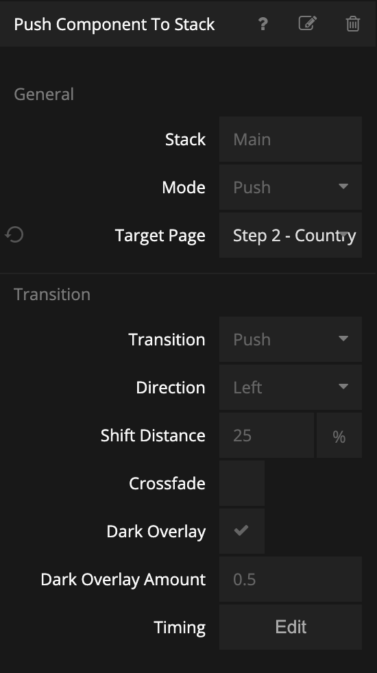 Try out the navigation to the next step. You will see that the Dark Overlay option in the Push Component To Stack makes it looks weird so untick that option. Feel free to play around more with the transitions. Maybe change the Shift Transition to 100% to make it look more like a proper transition. You will see that it's important the the containing Group node clips its children for the transition to work. In the Popup Base component, that is the second Group that holds the Component Children.