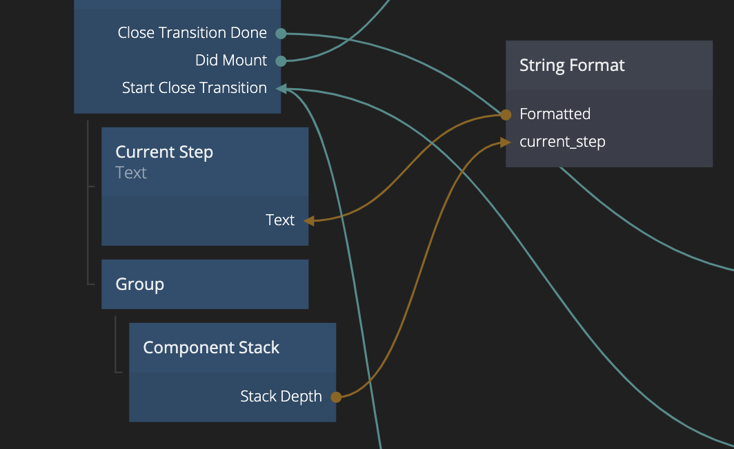 In our Wizard we still have our text Step x of 3. We want to make that work. Go back to the Add New Person Popup. The Component Stack has an output called Top Component Name that will hold the name of the component that's currently on top Note that it's the name of the component in the Component Stack, not the component that's used to represent it. So in out case it will be Step 1 - Name, Step 2 - Country, Step 3 - Location. If we somehow could transfor this to the number 1,2 or 3, we can just feed it into our String Format. What might be an even easier solution is to use the Stack Depth property. Since we use Push rather than Replace our Component Stack will grow in size from 1 to 2 to 3, which is exactly what we want. So we connect it to the String Format node.