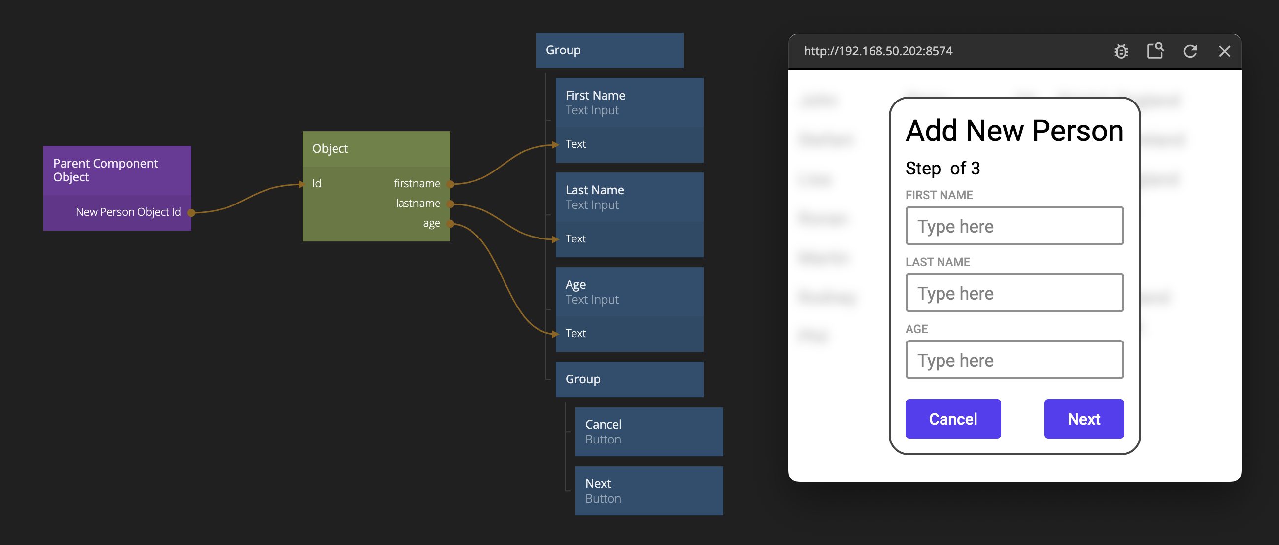 So let's add three Text Input fields (for first name, last name and age). Hook them up to the Object (by adding the properties firstname, lastname and age - the last one being a number input only Text Input). Also add two Buttons one for "Cancel" and one for "Next" in a horizontal layout in a Group.