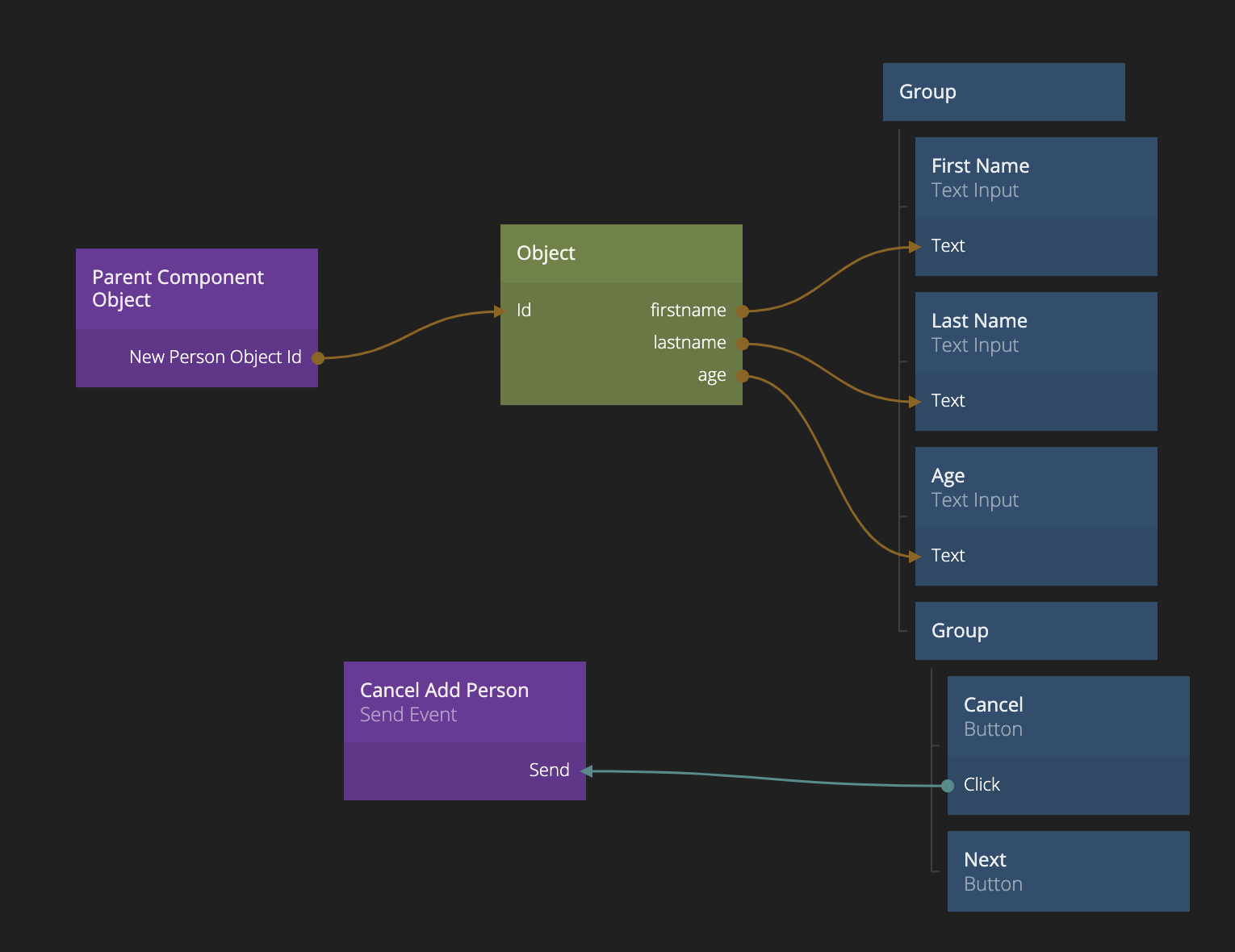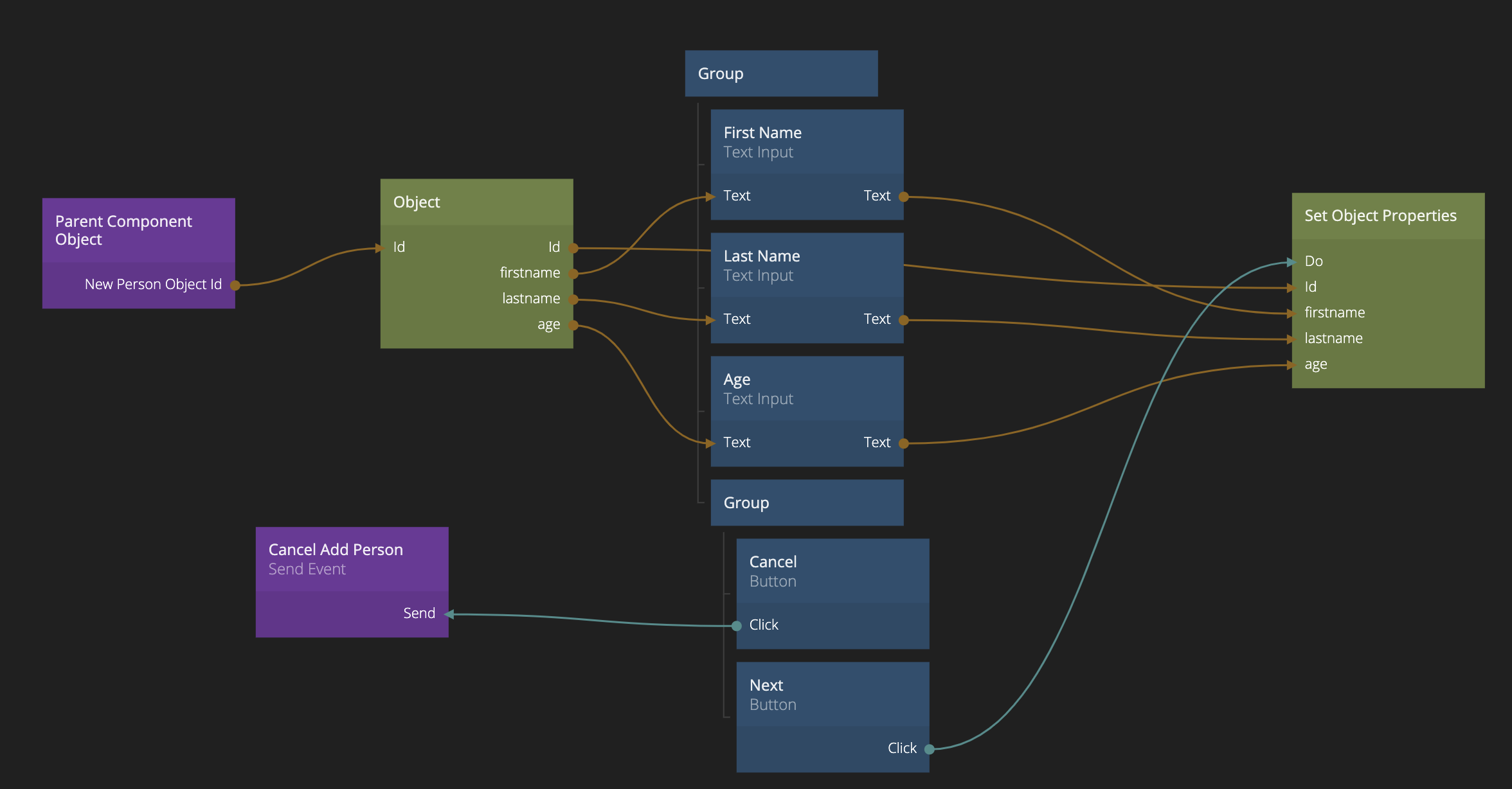 Ok, now let's go back to the Step 1 component to finish it off. First, we need to save the content of the Text Inputs in the Object. We do this by adding a Set Object Properties node, add our three properties (firstname,lastname, age). Also, don't forget to set the Id to the same Id we got from our Parent Component Object. Then we connect the Click signal on the "Next" Button to the Do signal on the Set Object Properties.