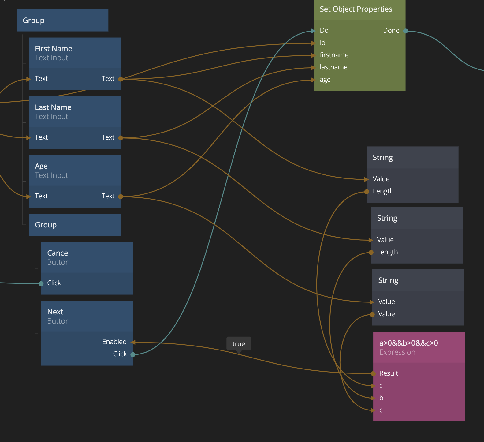 In Step 1 we can look at the length of the Text value coming out of the Text Input nodes. We use the String node which has a Length output. We connect these three length values to an expression that makes sure all three of them are greater than zero (using the expression a>0&&b>0&&c>0). Then we connect the Result of that expression to the Enabled input of the "Next" Button.