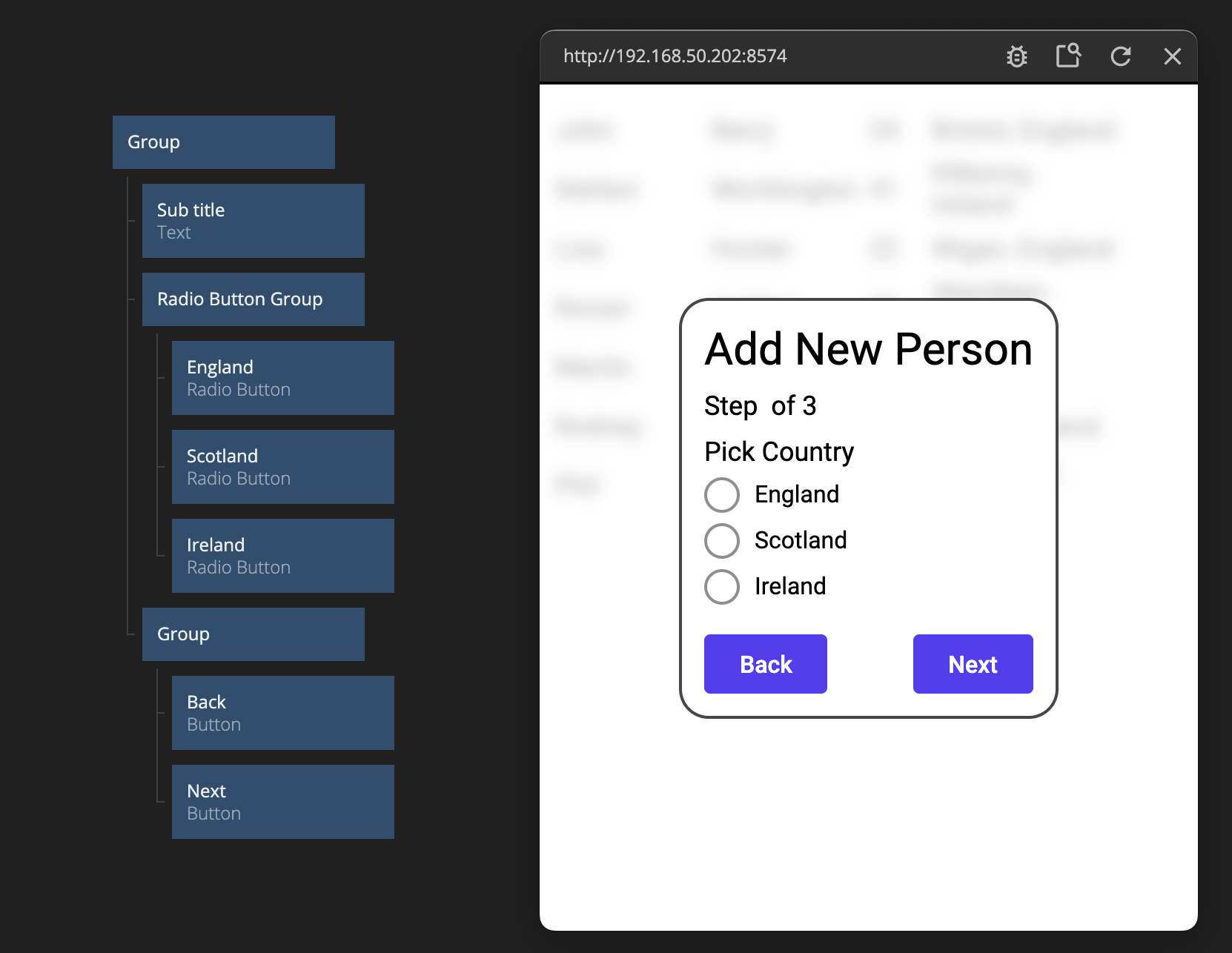 This will be a simpler form, containing a Radio Button Group with our country options. So let's add it in, together with three Radio Buttons. We only have three options in this case, England, Scotland and Ireland. Make sure both Label and Value of the Radio Buttons are set to the respective value. Also add a sub title that says Pick Country. Finally, add two buttons at the bottom Back and Next. We can copy/paste them from the previous step and just change the title of the first Button.