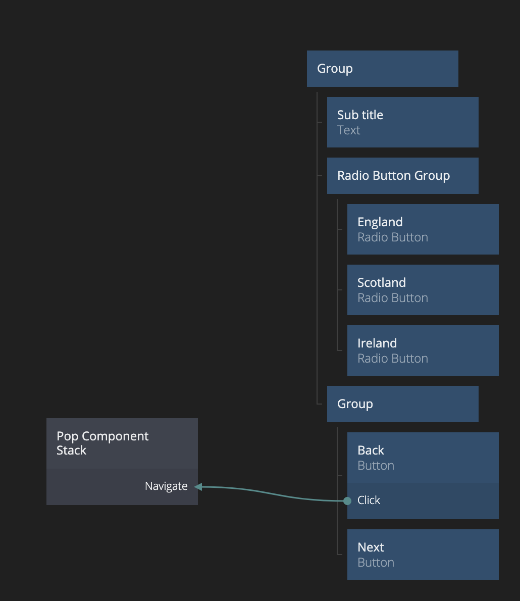 Now, if you go back to Step 2, and add in a Push Component To Stack and select Step 3 as the target (also fix the transition as before), you will se that there is a new input called Country. We can connect the Value of the Radio Button Group to the Country input. Also connect Click on the "Next" Button to Navigate on Push Component To Stack.