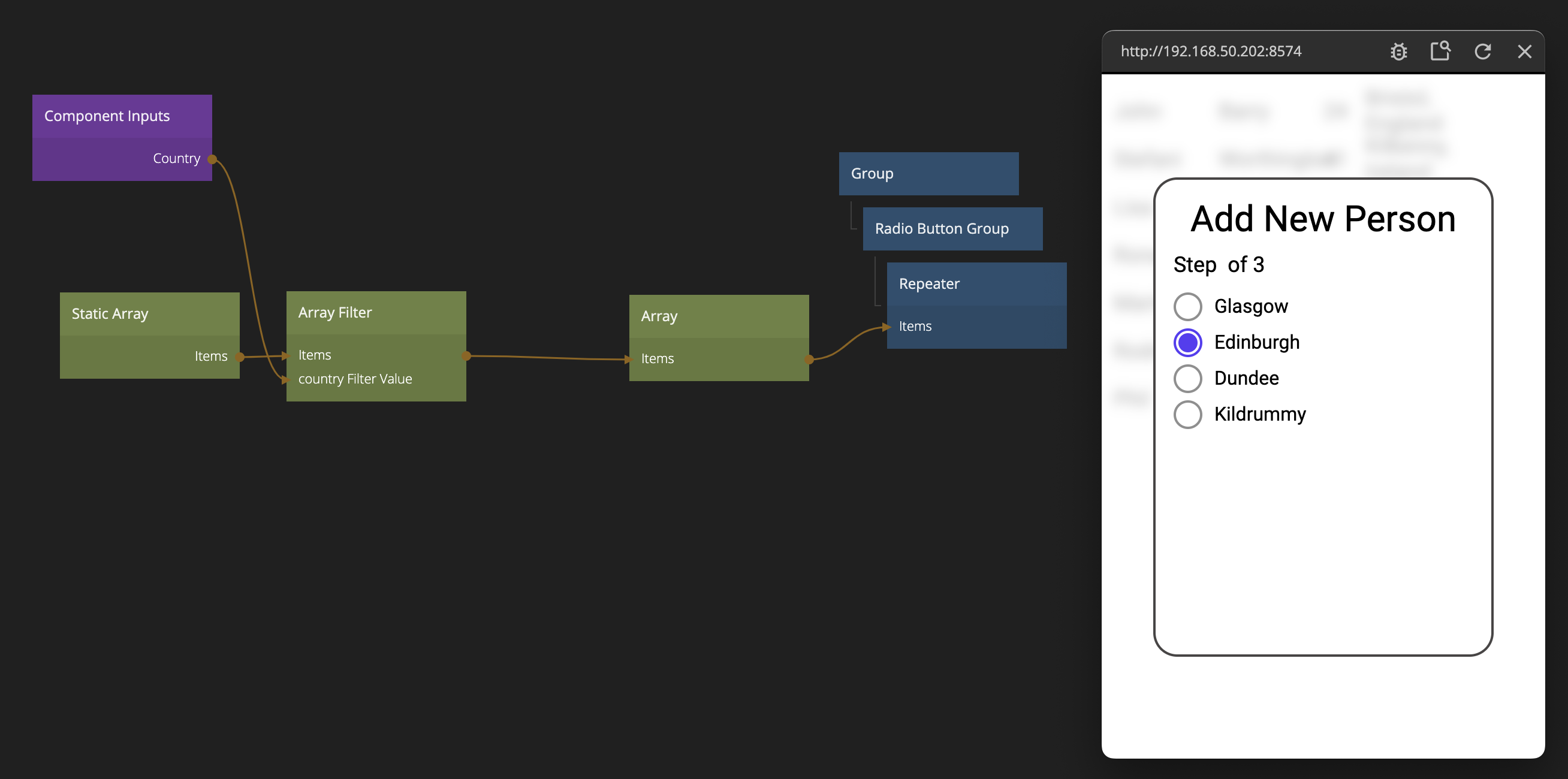 We want to present a Radio Button Group with only the valid cities for the country that was selected in the previous step. So let's start with an Array Filter.