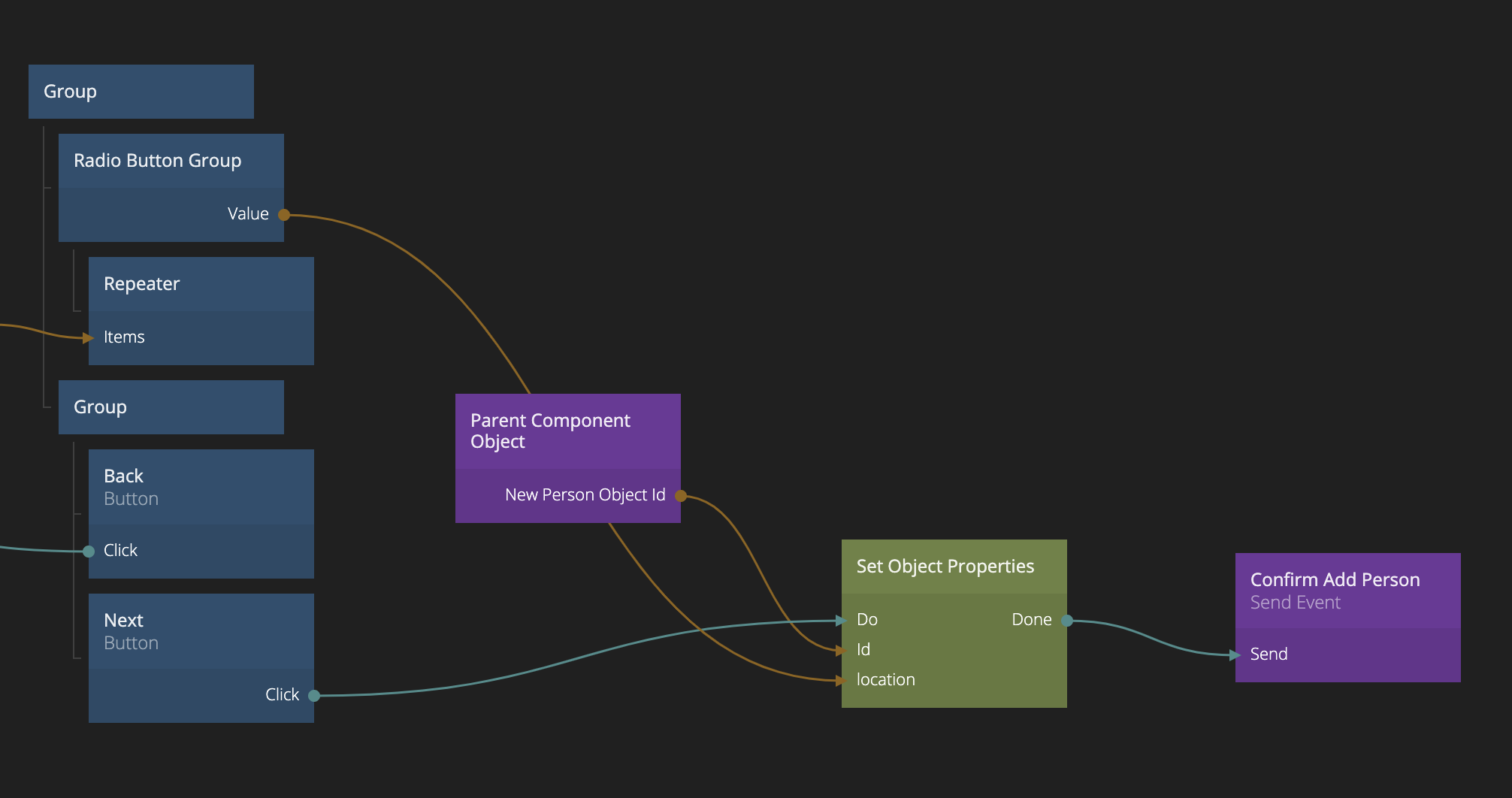 Finally we need to let the Create New Person Popup know that the Object is filled out when the user clicks "Next" on the last stage. Again, we do that by sending an Event this time with the Channel Name Confirm Add Person, send it to Parent. We do that once the Set Object Properties is done.