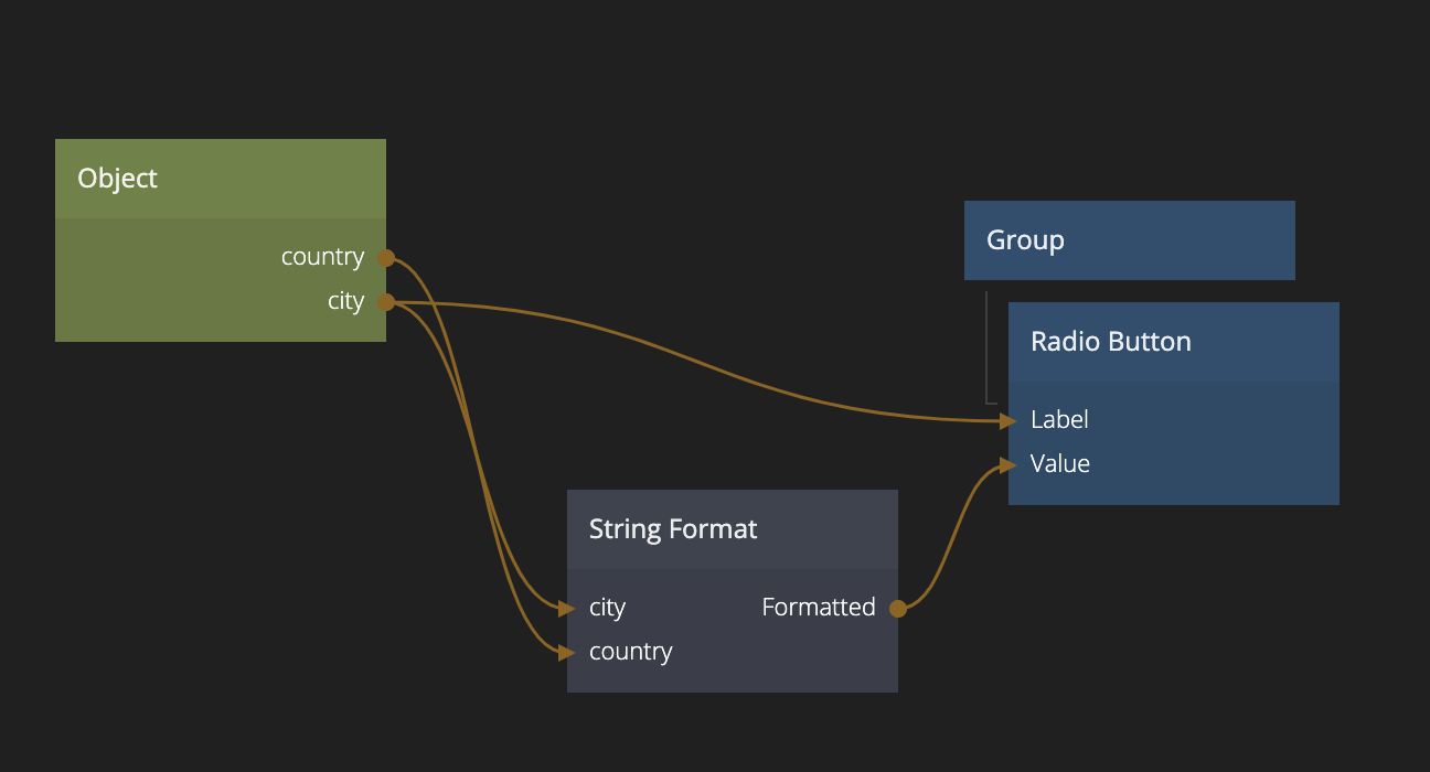 The Object has two properties country and city and gets its Id from the Repeater. Also note that the Value of the Radio Button is using a String Format (with the string {location}, {city}) to construct the final location string that matches the data model (for example Dublin, Ireland).