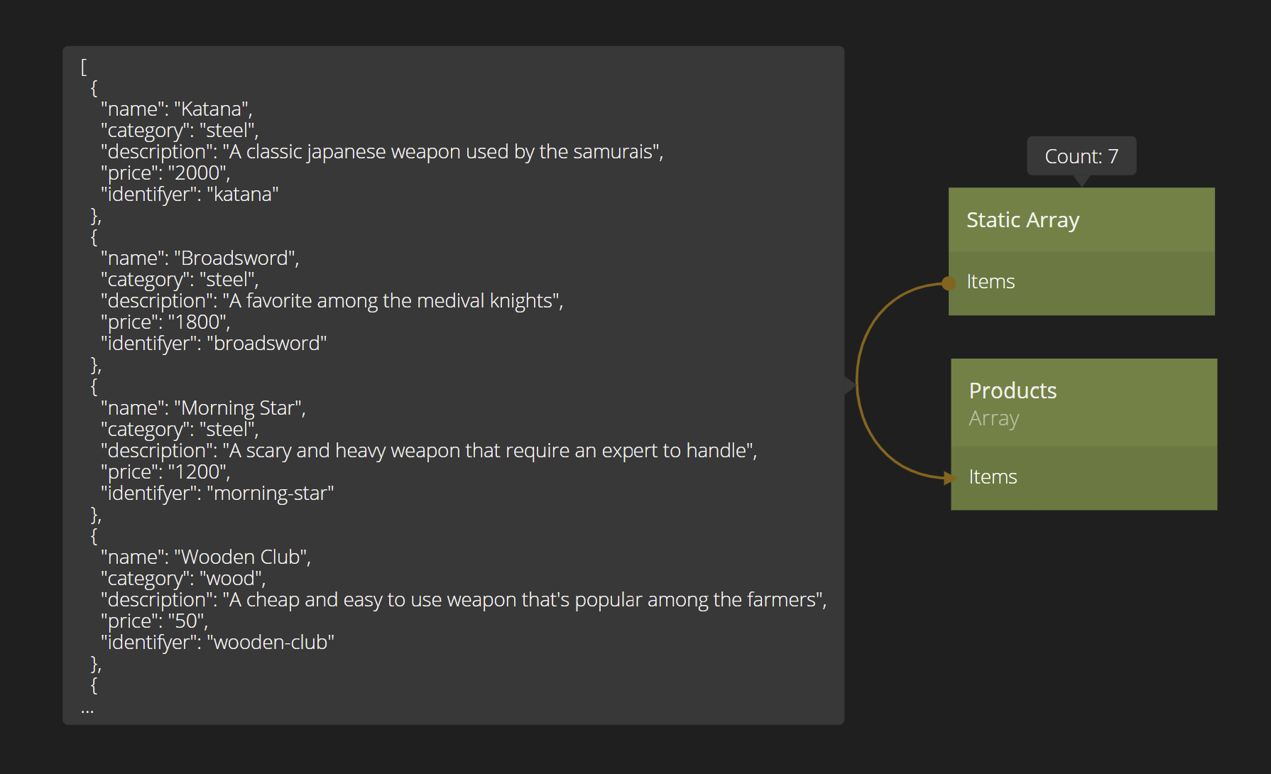 First we put the Products in an Array that we can find anywhere in the app. Create an Array node next to the Static Array. Give it the Id Products. Then connect the output Items on the Static Array to the input Items on the Array.