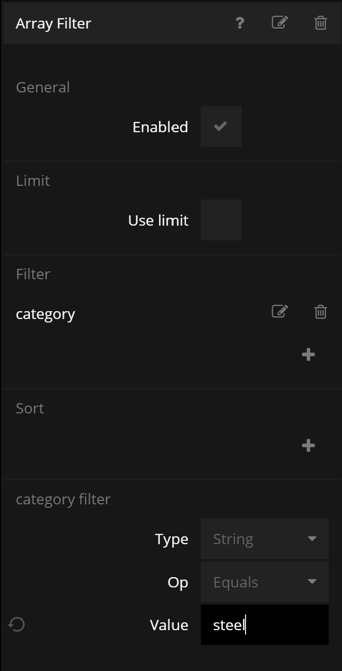 So we connect it to an Array Filter, which we filter on "identifyer". We should only get one item out, so we can take the First Item Id and connect it to the Id of an Object node.