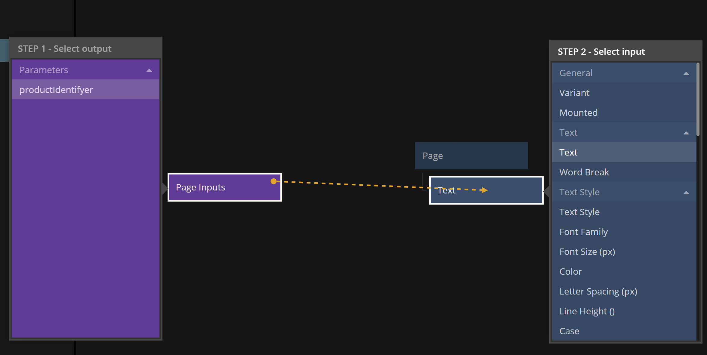For test purposes, add a Text node to the Page node and connect the "productIdentifyer" output to the Text input of the Text node.