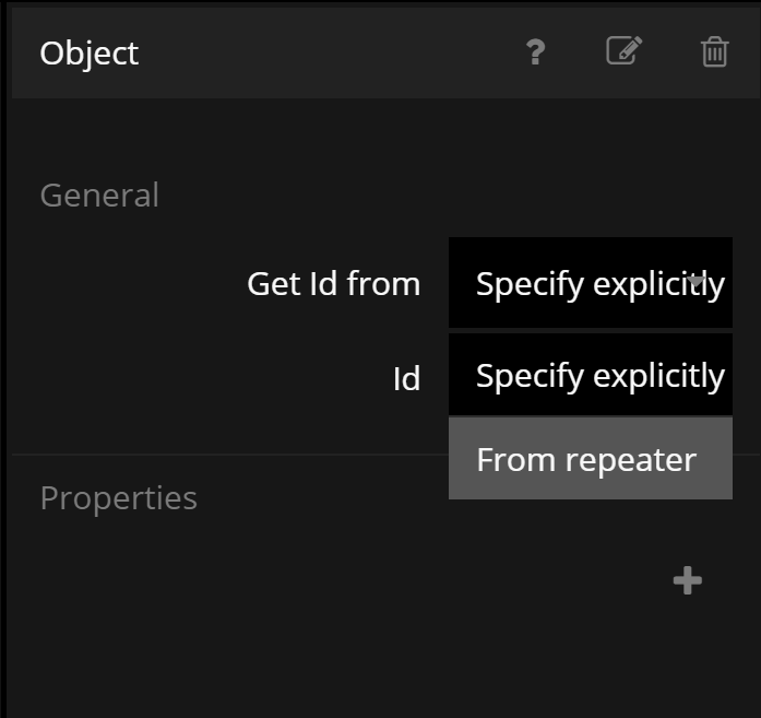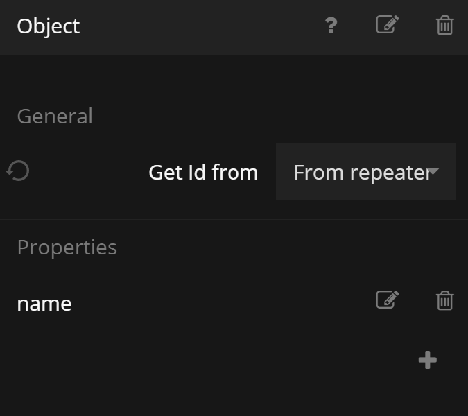 We will still not see anything because we have no list item that the Repeater can use to visualize the items. So lets create a new component, we call it "Product Item". In the new component we add a Text node as the only child in the Group. Now we need to retrieve the individual Object that contains the Product entry. Create an Object node and make sure it gets its Id from the repeater node. Also add a property "name" to the Object.