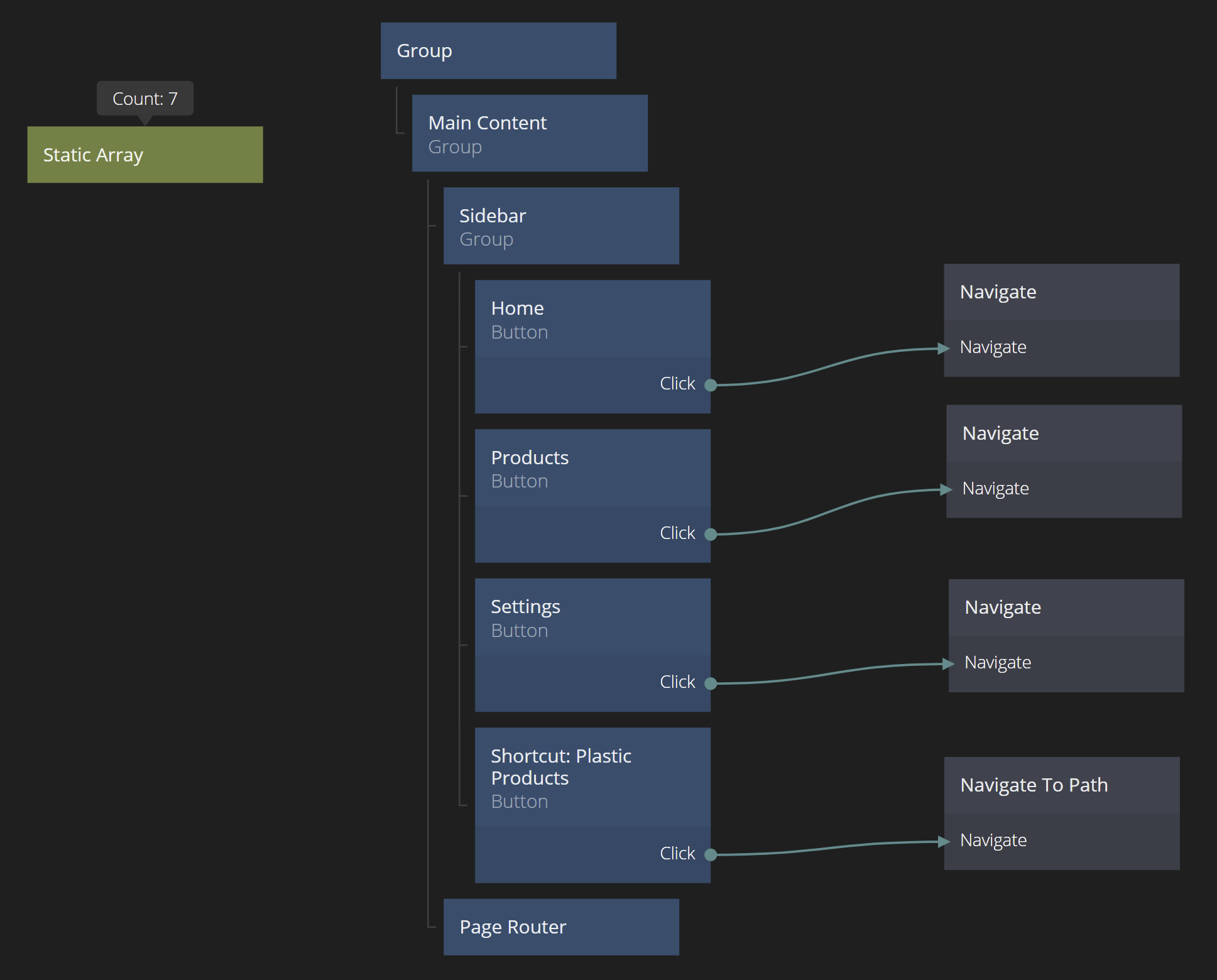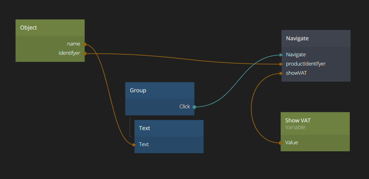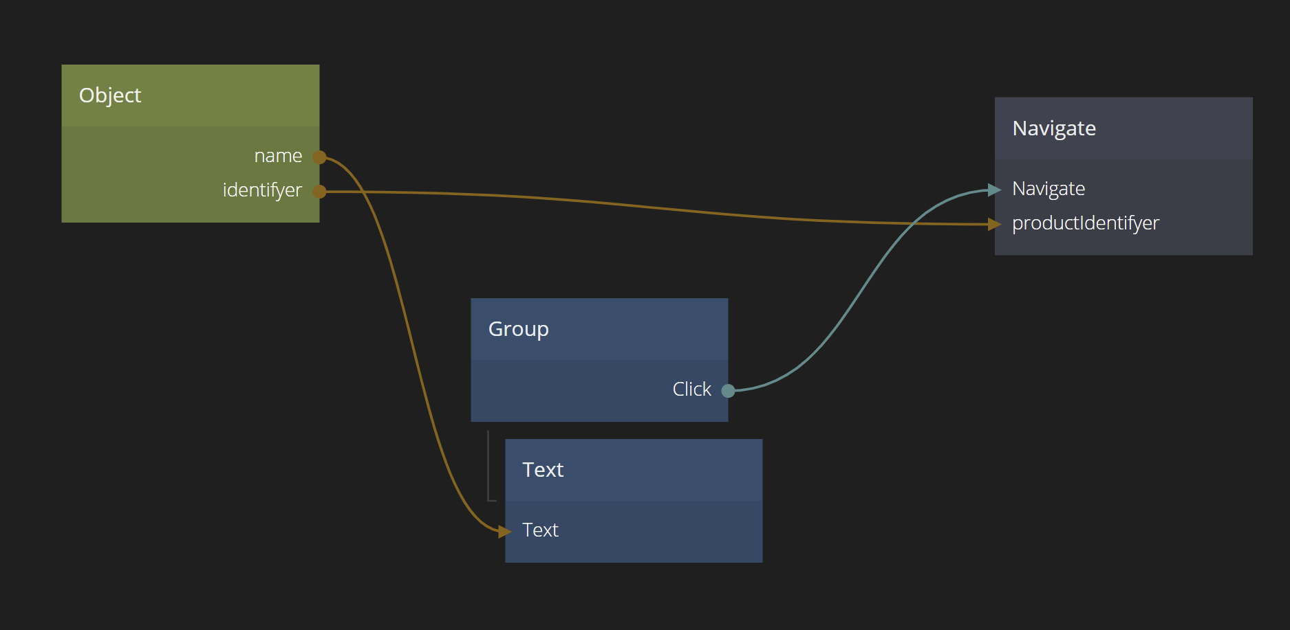 We want to set it to the "identifyer" value from our product so lets add the property "identifyer" on our Object and connect it to the "productIdentifyer" input of our Navigate node. Also, connect the Click signal from the Group node to the Navigate signal on the Navigate node.