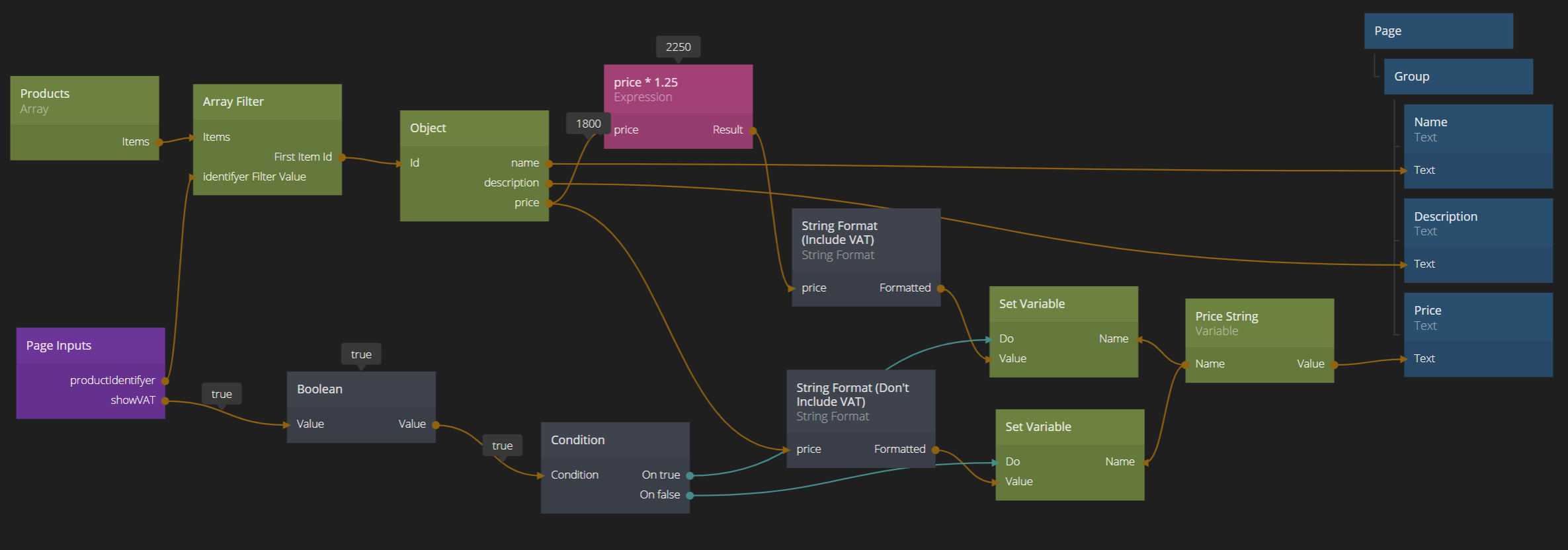 The only thing left is to receive the parameter in the "Show Product" Page and show different prices depending on the parameter. We add a Variable that will hold the string to be shown (the price string including the VAT or not). Then we add a Condition node to set the correct string to the Variable. The nodes look as below: