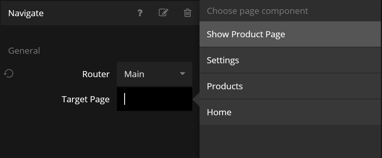 Add a Navigate node and make sure the associated Page Router is "Main". Then pick the "Show Product Page" as the target.