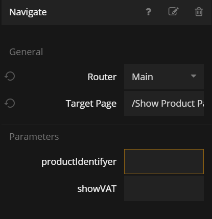 Go to the "Product Item" component where we do the navigation to the "Show Product" Page. If you click the Navigate node you will now see that the showVAT parameter is availabel as an input.