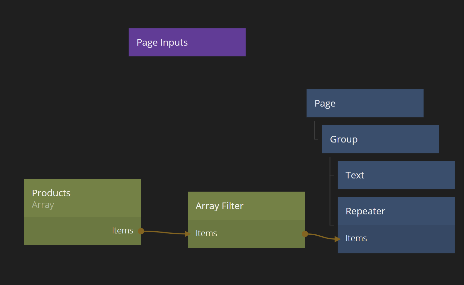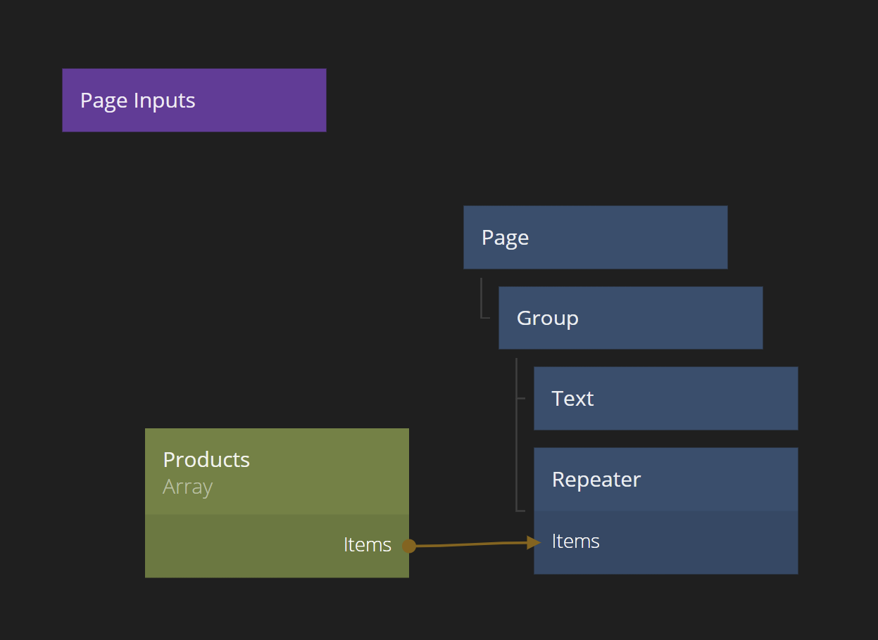In the steel page, add a Repater node as the second child of the group. Also add an Array node. Make sure its Id is Products, i.e. the same array that we filled with the product data. Then connect the Items output of the Array connects to the Items input of the Repeater.