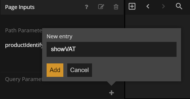 Lets add a Query Parameter to our Page Inputs node. We will call it showVAT and we will use it to determine whether the price should include VAT or not in the Show Products Page.