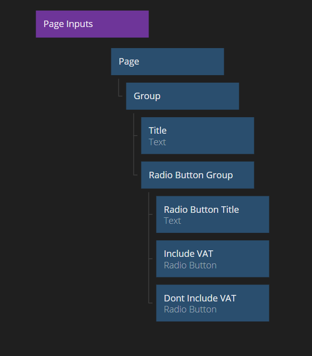 Add a Radio Button Group with a Text node and two Radio Buttons as children. The text will be the title for the group. Make sure the first Radio Button have the value showVAT and the second dontShowVAT.
