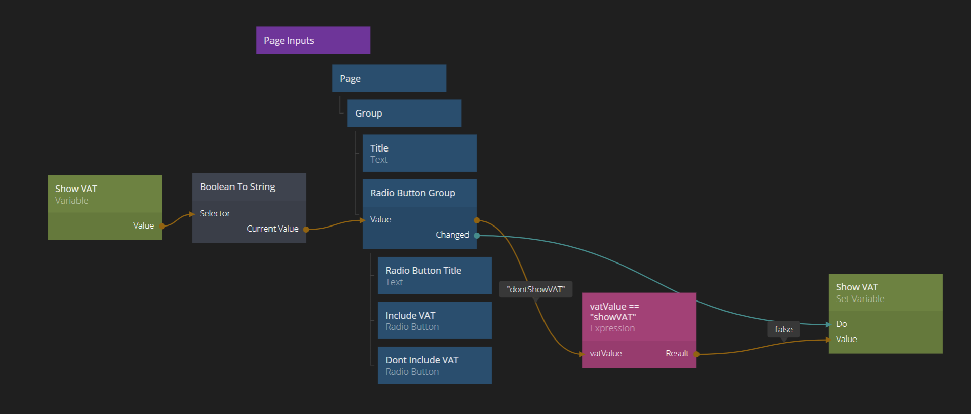 So lets save the VAT state, using a bit of logic and a Variable / Set Variable node. Note that we connect the Variable that holds the current value to the Value of the Radio Group node to make sure it reflects the current setting when navigating to the Settings Page. (Remember that the Page Component will be re-instanciated every time you navigate to it so we need to set the initial value every time.)