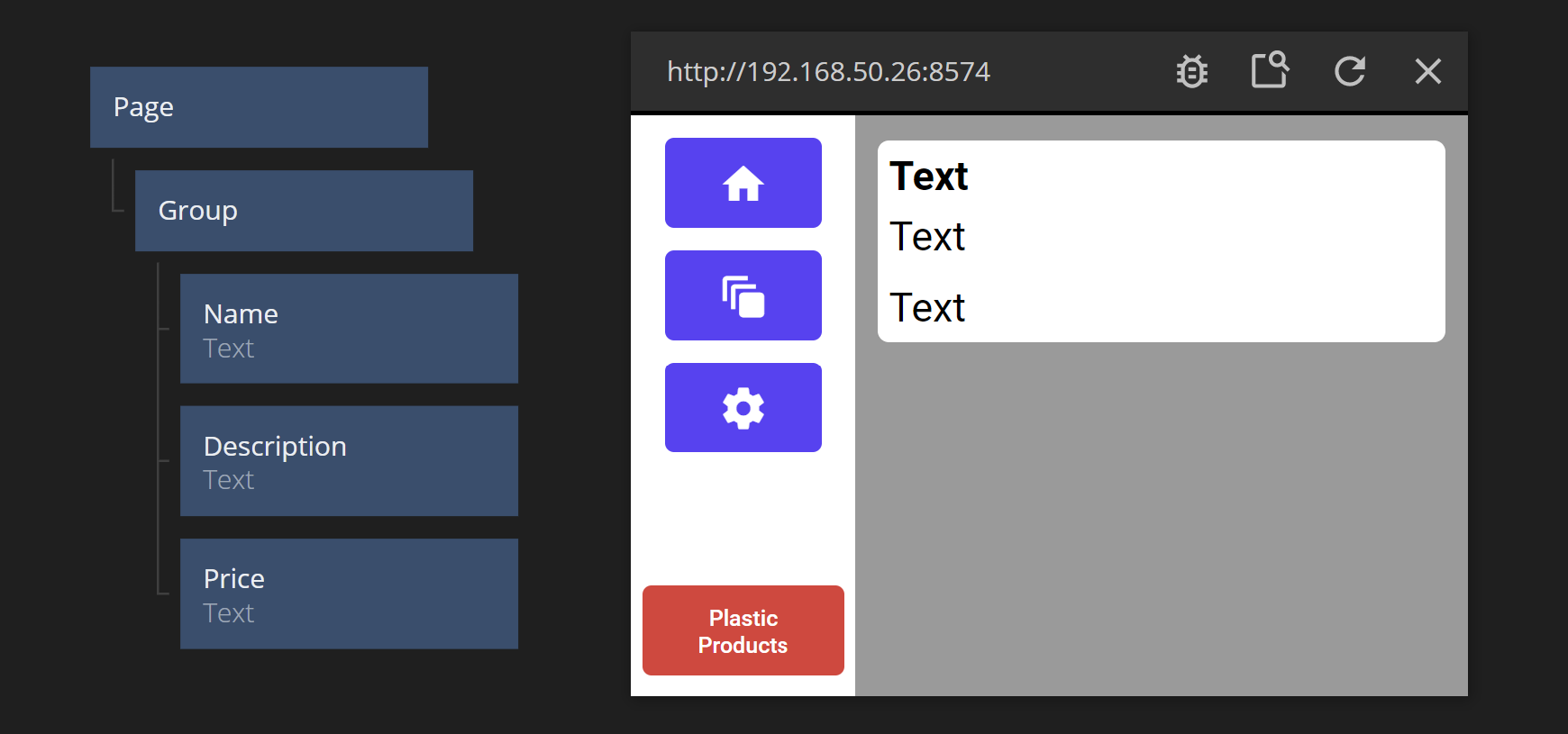 Then add three Text nodes, one for "name", one for "description" and one for "price". Make the first Text node bold. Also, add some nice margins in-between them.