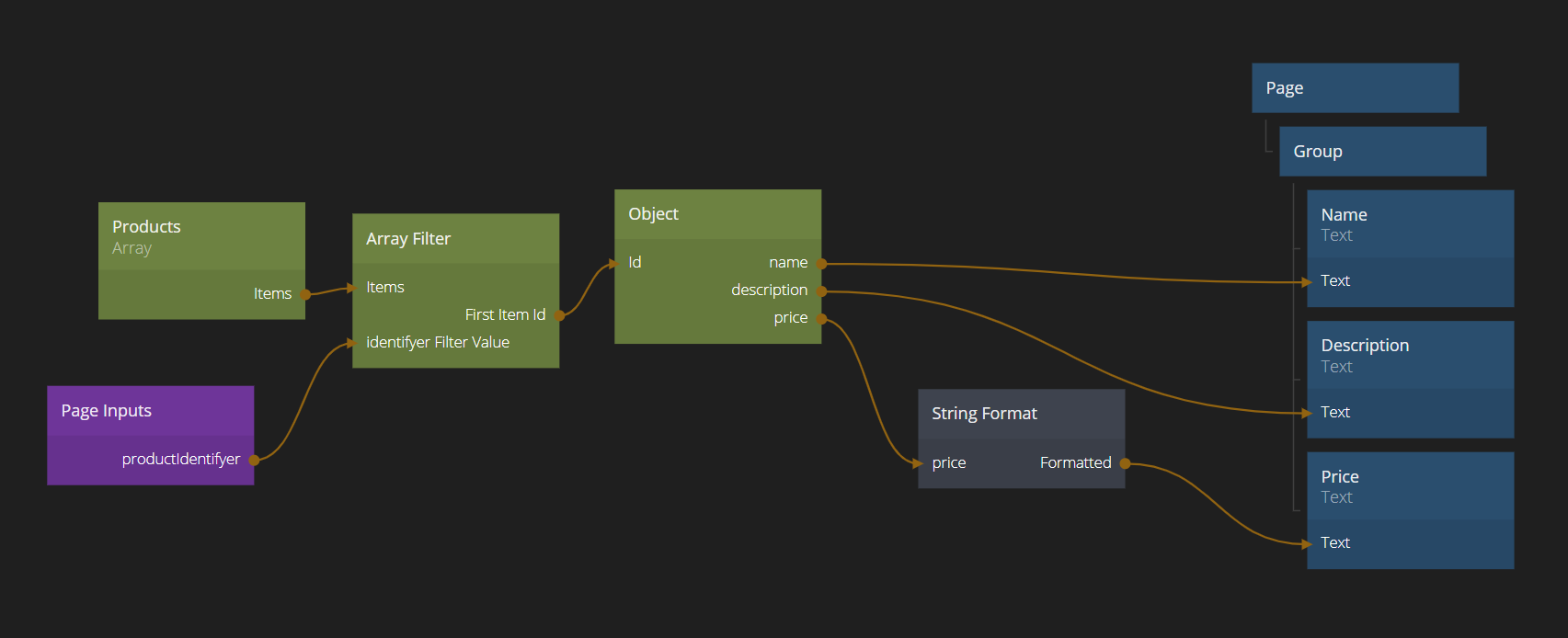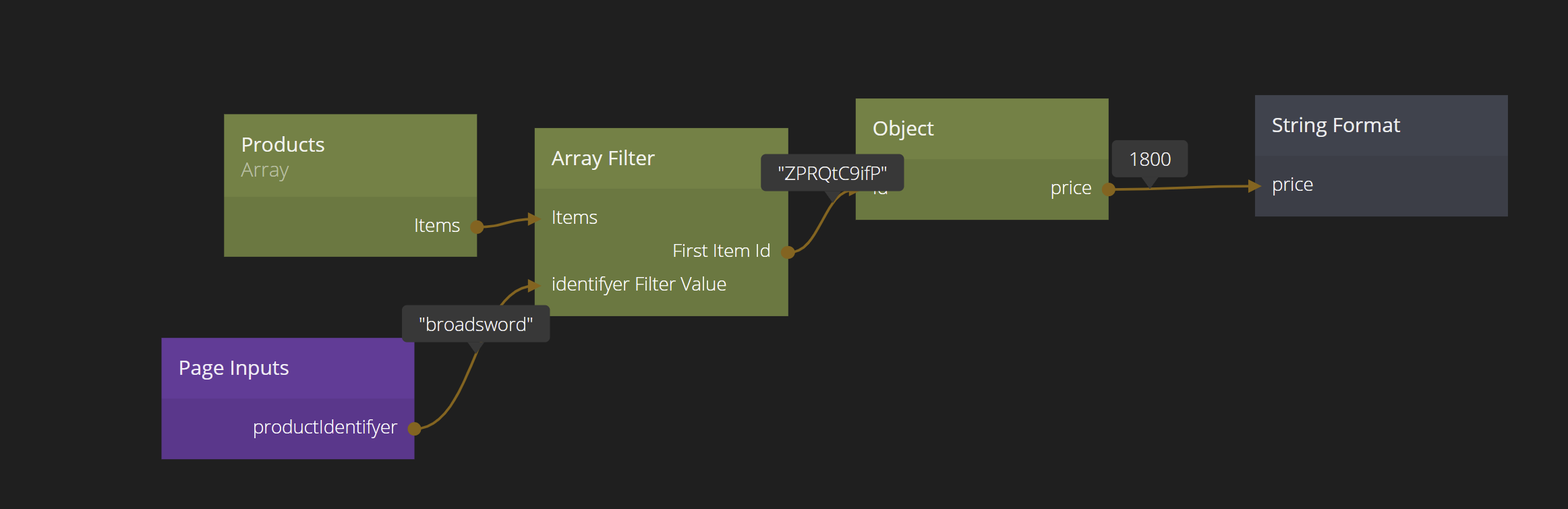 Now we need to connect the data. We have the "identifyer" coming in as our Path Parameter. We are going to use that to filter out the right Object from our "Products Array".