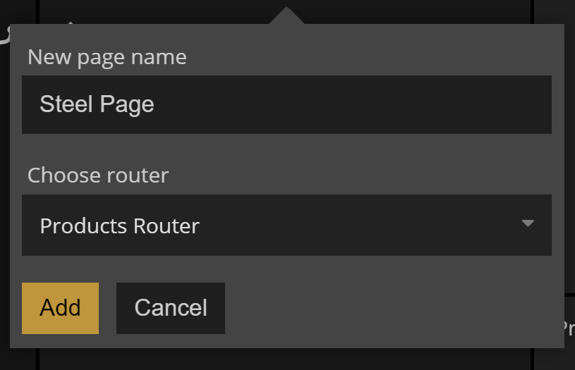 As you can see you now have to select which Page Router you want to add the Page Component to. We choose our newly created "Products Router".
