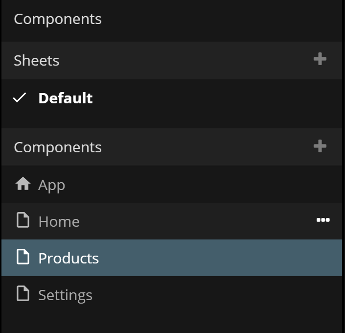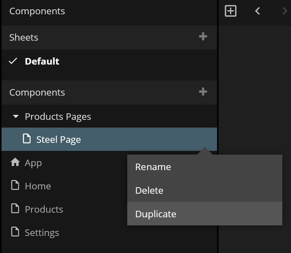 The next step is to add three new Page Components using the "+" icon on the Components List. To keep things tidy, we first create a new folder, "Products Pages", and add the Page Components under that folder, "Steel Page", "Wood Page", "Plastic Page"