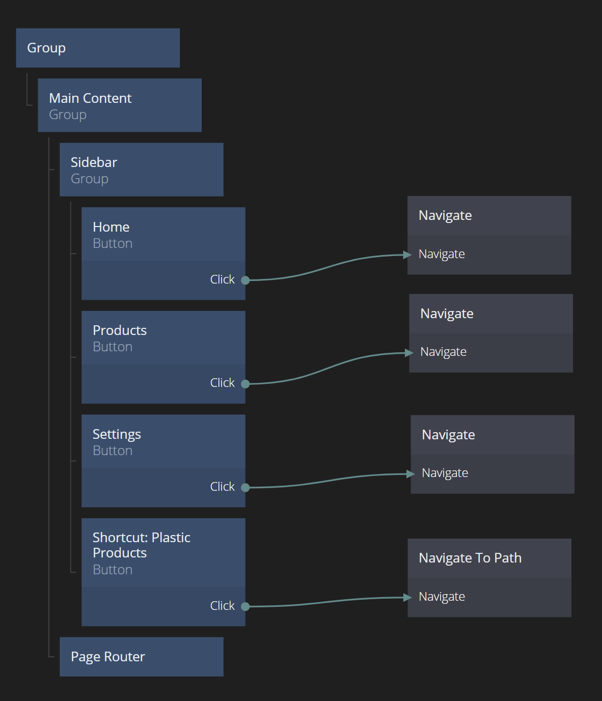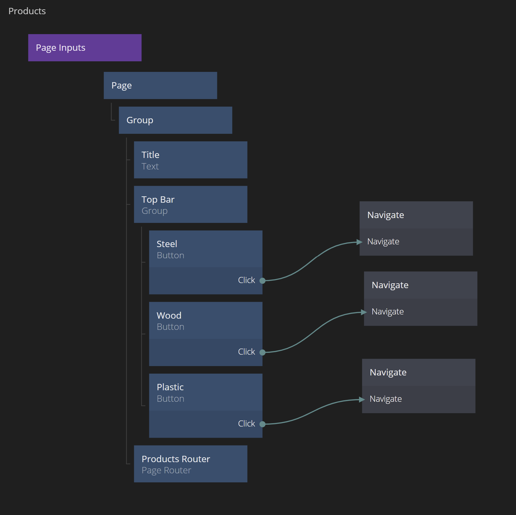 Now lets hook up the Top Bar. Create three Navigate nodes in the Products Page Component. Set each of them to target the Products Router Page Router and chose the respective target page.