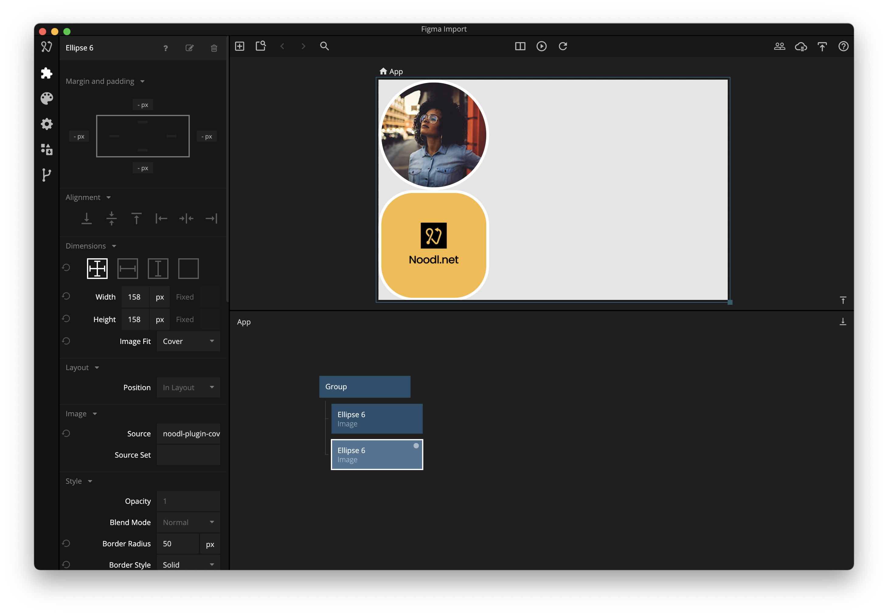 Figmaの楕円形が、正しいサイズ、画像アセット、枠線でNoodlのImageノードにマッピングされたことに注意してください。