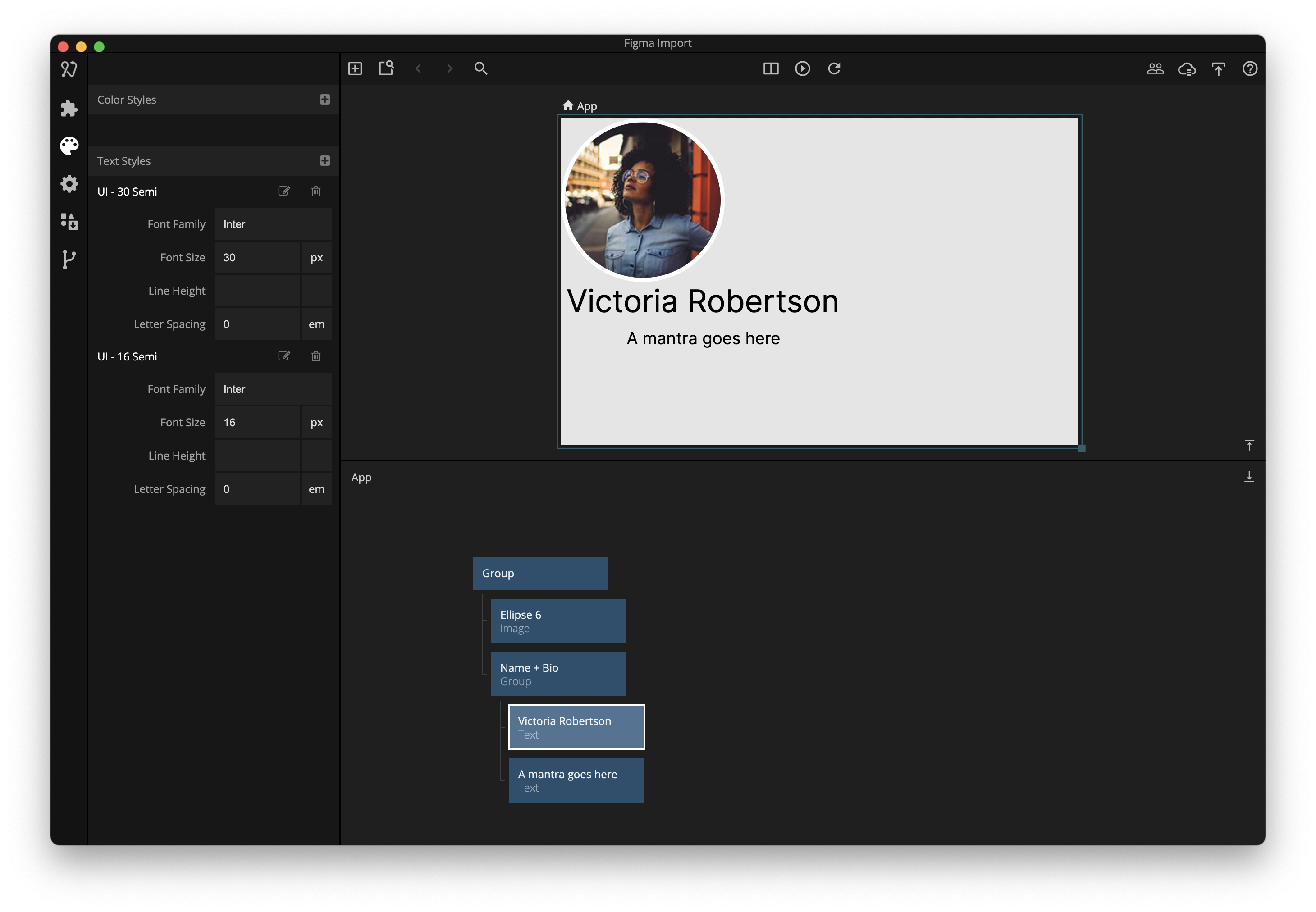 ほとんどのアプリケーションは、Figmaで通常設計されるものよりも動的です。テキスト入力はインタラクティブであり、ラベルと値はデータ駆動型であり、リスト内のアイテムの数は固定されていません、グループにはパディングがあります、などです。これは、エクスポートされたノードにまだ行うべき作業があることを意味します。