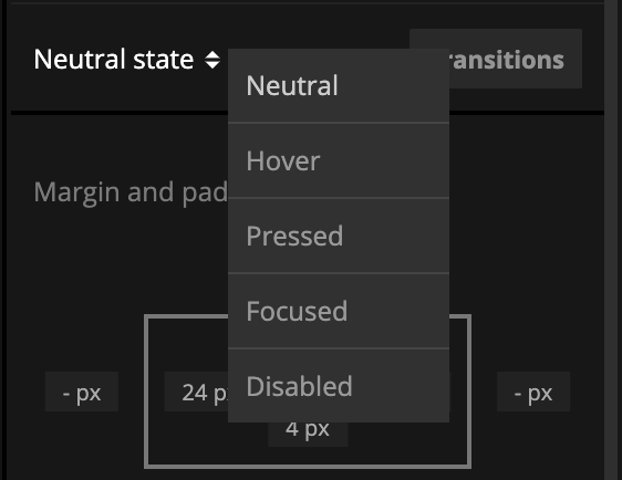 When working with Visual nodes we often find ourselves in situations where we want to style the node differently based on the user interaction. We might want to have a different background color when hovering a button, or indicating that a checkbox has been checked. This is done using Visual States in the nodes settings in the Property Panel.
