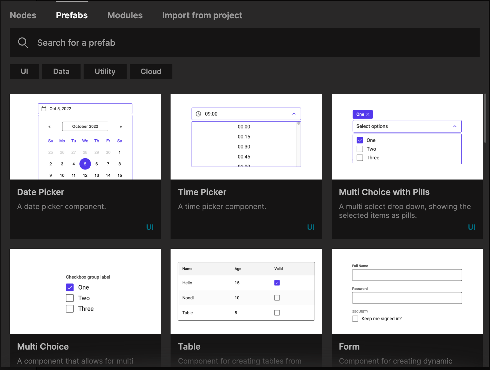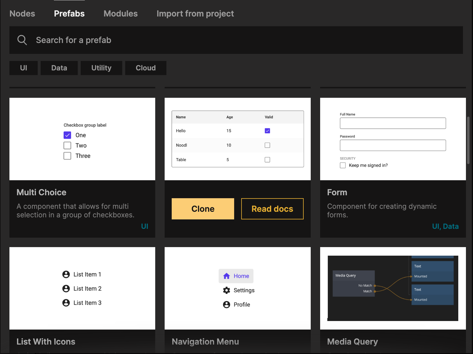 Next, in the Start Page, bring up the Node Picker and select the Prefabs tab. Find the Table prefab, and click Clone.
