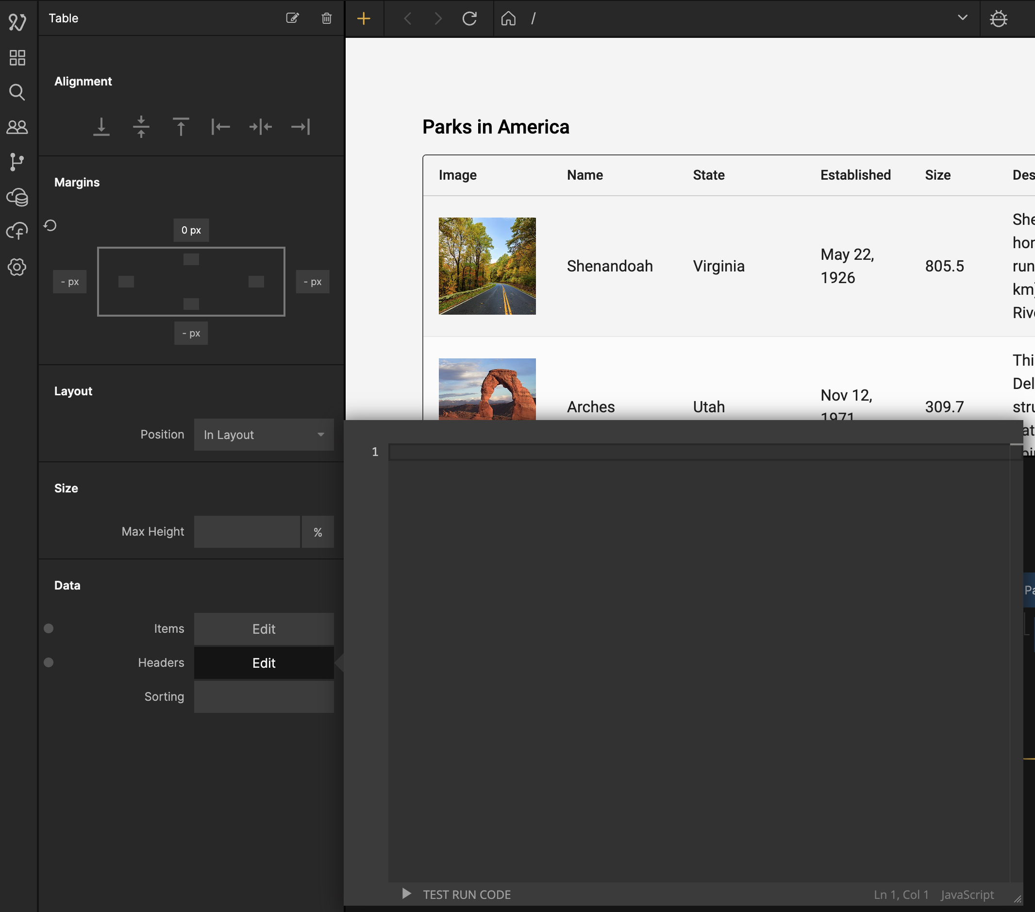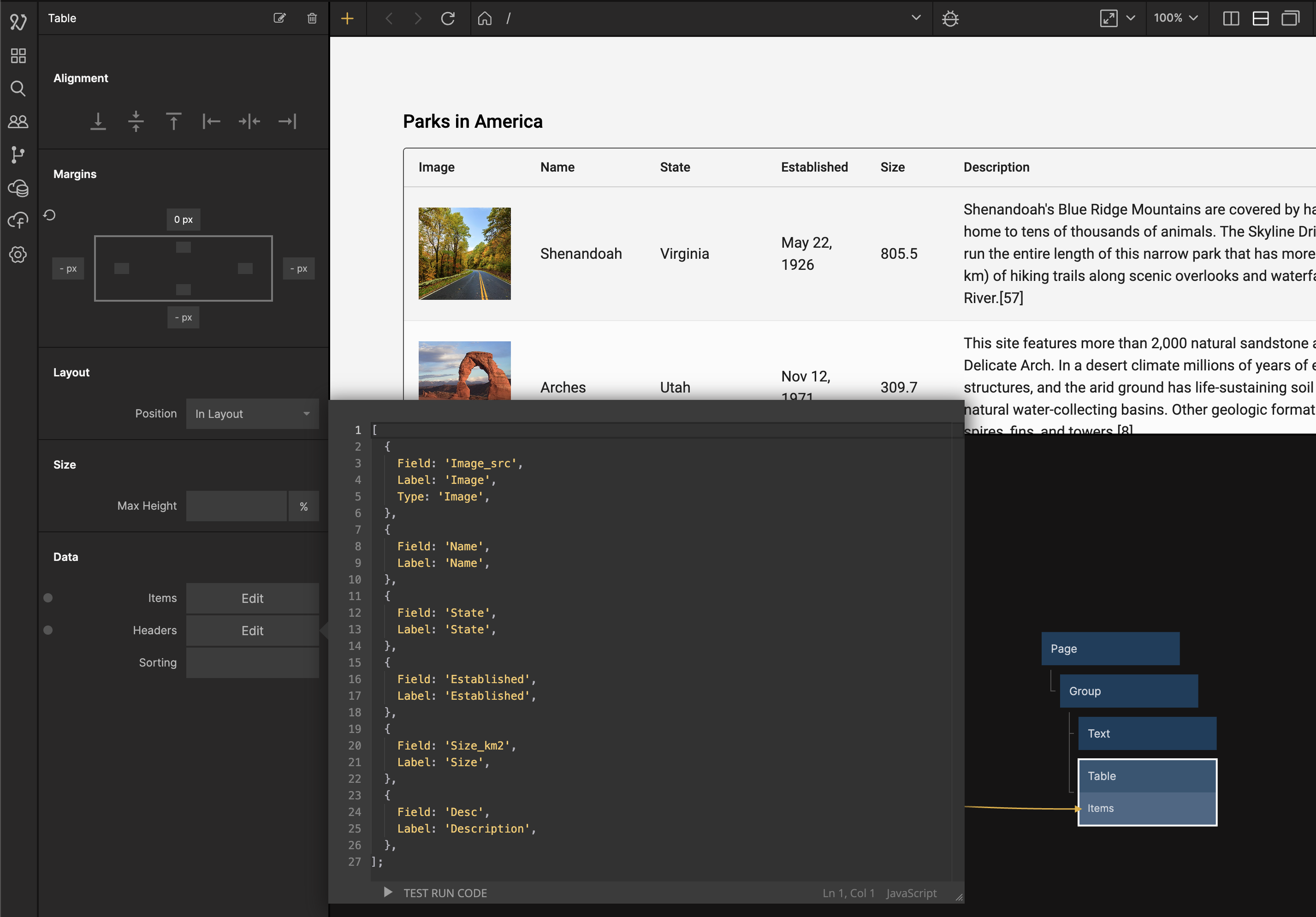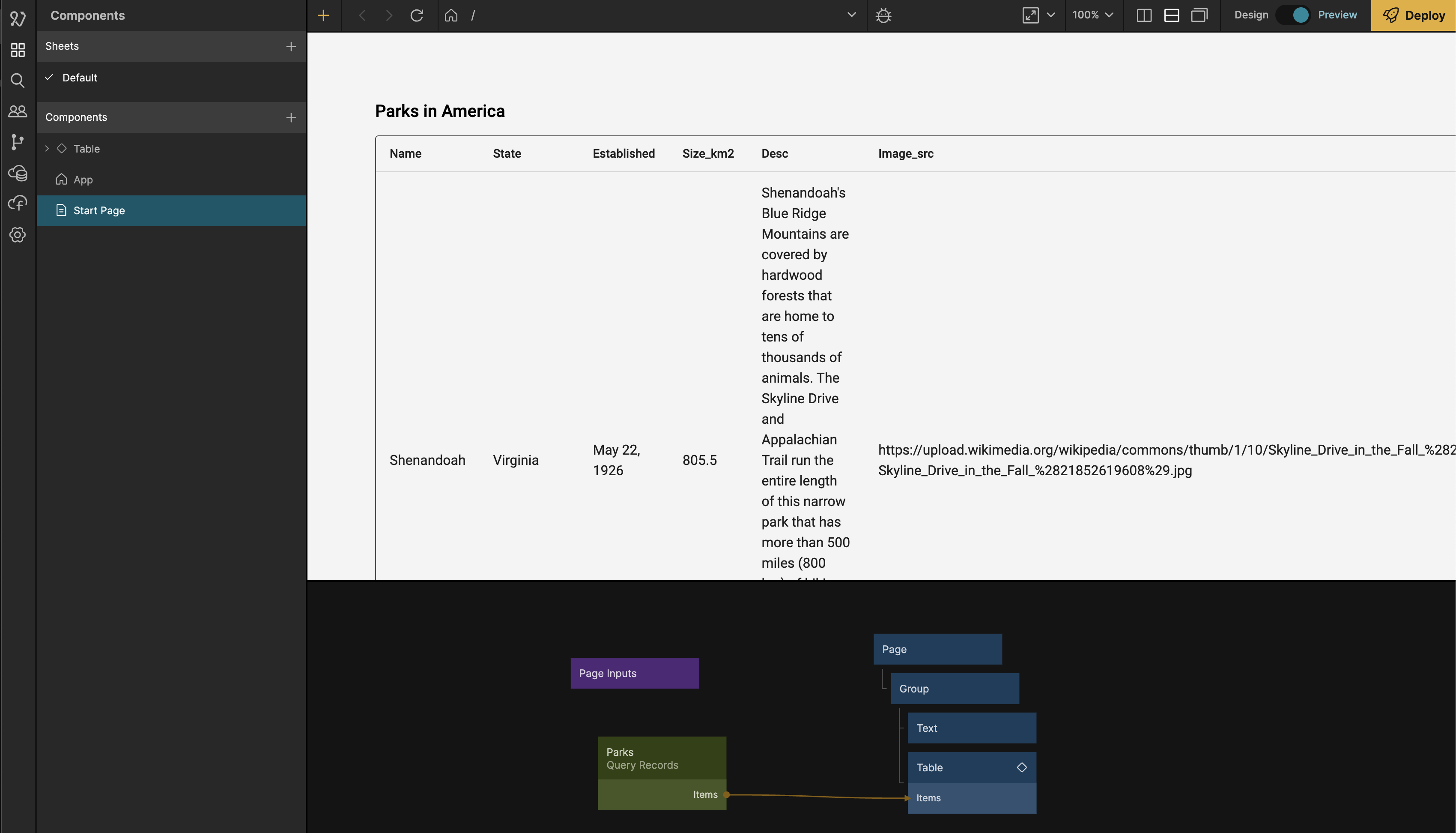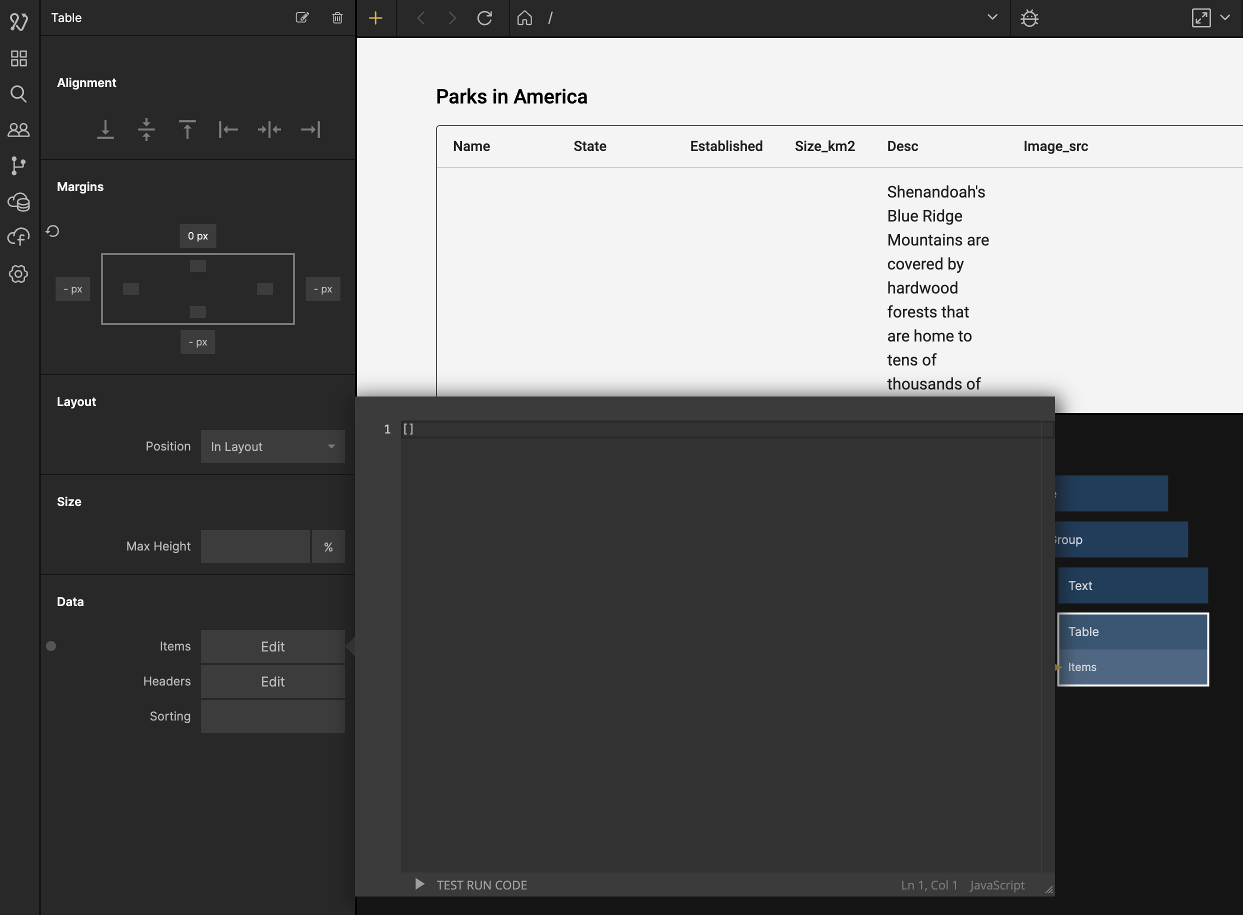 You might have noticed that when you reload the project, the Table shows some default data before the Query Records node has retrieved our parks data. To remove that default data, select the Table and click the Edit button for the Items and remove the objects in the array, so that you are left with an empty array like this: