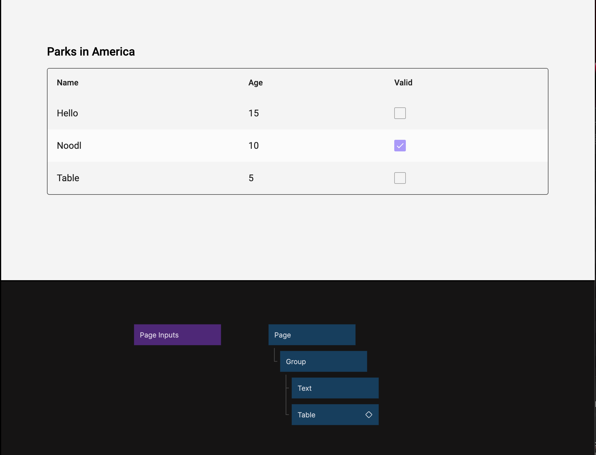 Add a Table node to the node tree, by either dragging it in from the components view or by using the Node Picker. Put the Table under the Text node. Your node graph should look like this: