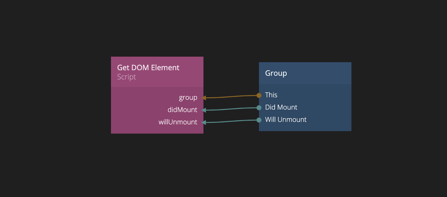 ビジュアルNoodlノードからDOM要素にアクセスするために、ビジュアルノードをスクリプトノードに接続します。入力タイプは "reference"(または "*" ですべてのタイプを受け入れる)であるべきです。この例ではGroupを使用していますが、どのビジュアルノードでも機能します。