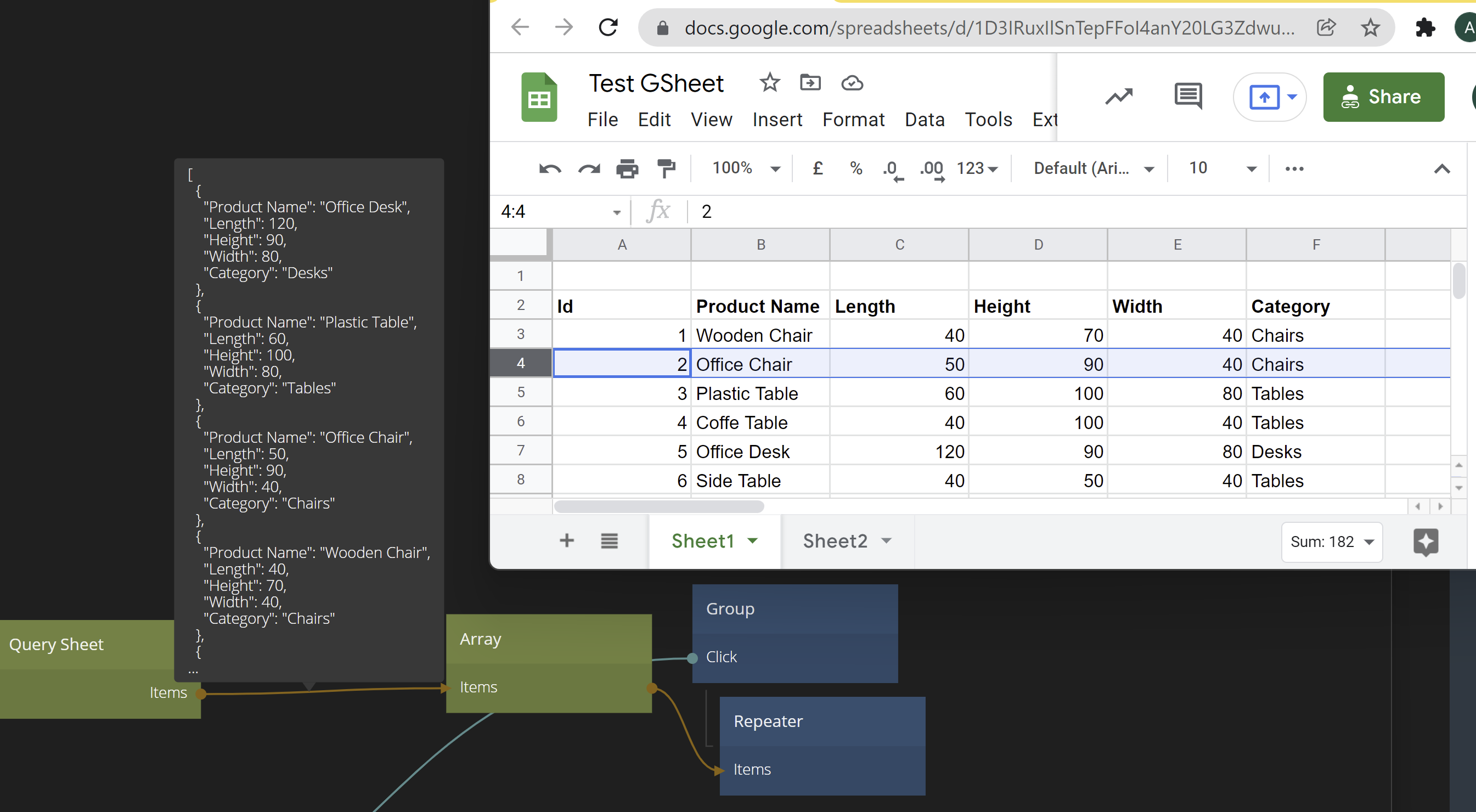 The results of the query is an Array, just as with a regular Query Record. The Array contains Objects that represents the rows in the Google Sheet. Each column value will be represented by a property in the respective object, with the same name as the column. When using a Sheet Row node, the Id of the object can be used to set the Row Id of the Sheet Row node.