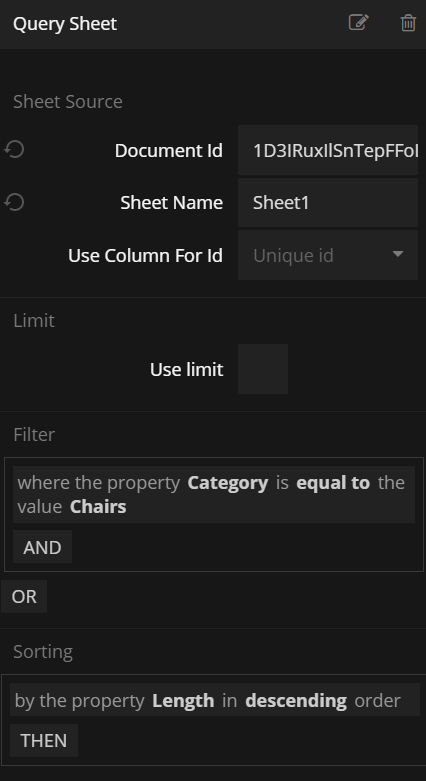 This node is used to query data from a public Google Sheet. You can filter and sort the data. The data is organized in Rows where the values of each cell in the row is exposed in a properties of the row.