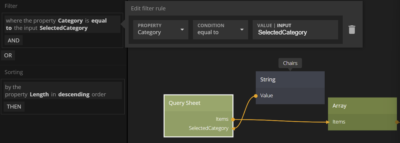 A filter can be added to the query. It can be a combination of various filter operators (equalTo, notEqualTo, exists, etc) depending on the type of the column. Multiple filters can be combined using AND and OR. A the values to filter against can be set dynamic by making the filter use an Input rateher than a static value. This will create an input on the node that you can connect.