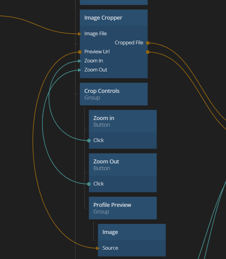 This module contains a simple Image Cropper component, along with an example of how to use it. It's mainly intended to crop images for e.g. profile pictures. The cropper takes a File containing an image as an input (typically coming from an Open File Picker node). It then lets the user pan and zoom in the image to find the area to crop out. The Image Cropper provides a URL to the image and the file object to the area that's currently being cropped out. This file is typically passed to a Upload File node.