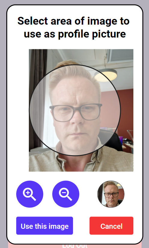 The component itself is relatively simple. It shows the provided picture and a mask on top. The area in the mask is what will be cropped out. The user can pan around and Zoom using the scroll wheel. You can also zoom in and zoom out by triggering signals (e.g. coming from Buttons). The mask can be customized to fit the style of your app.
