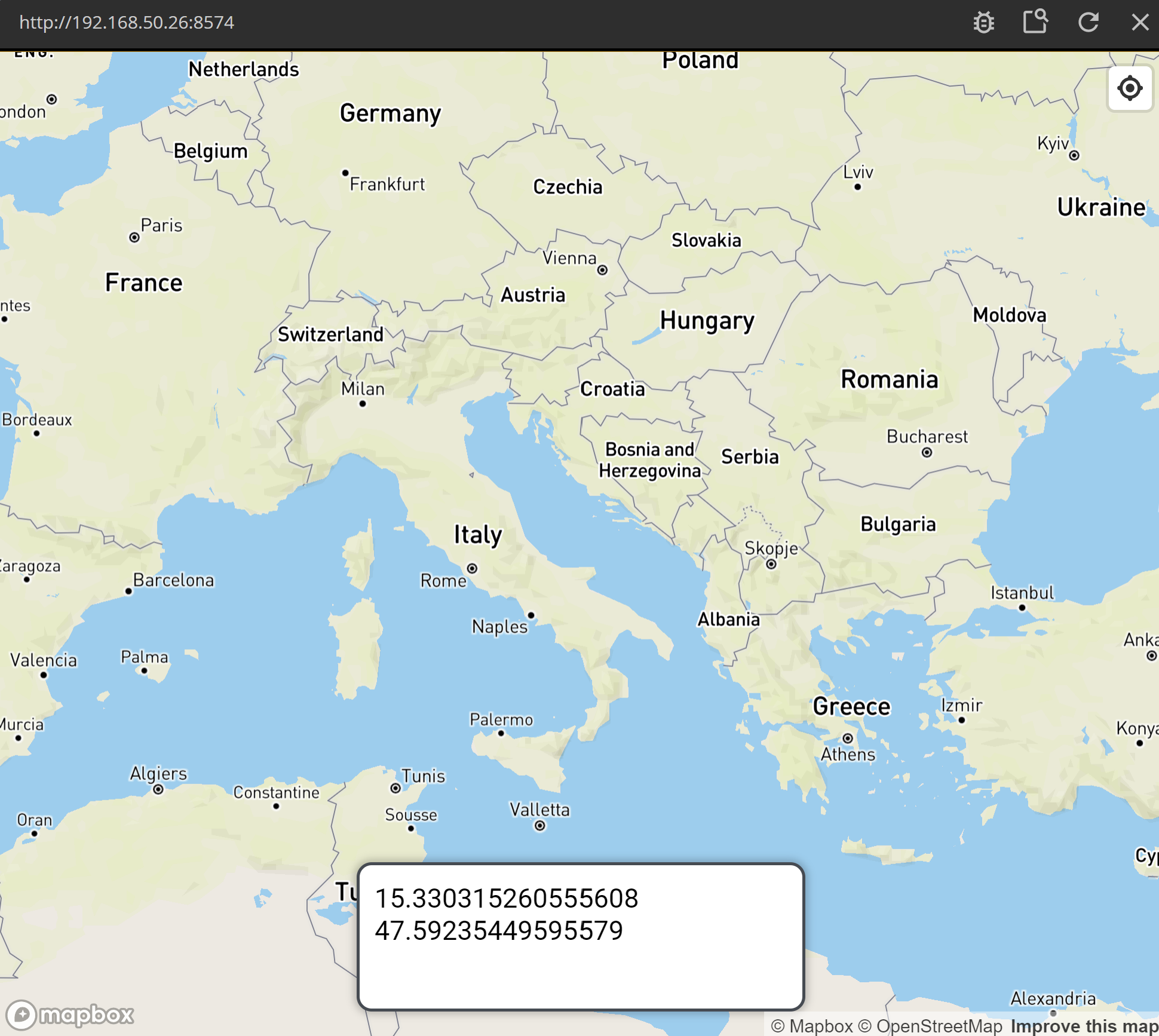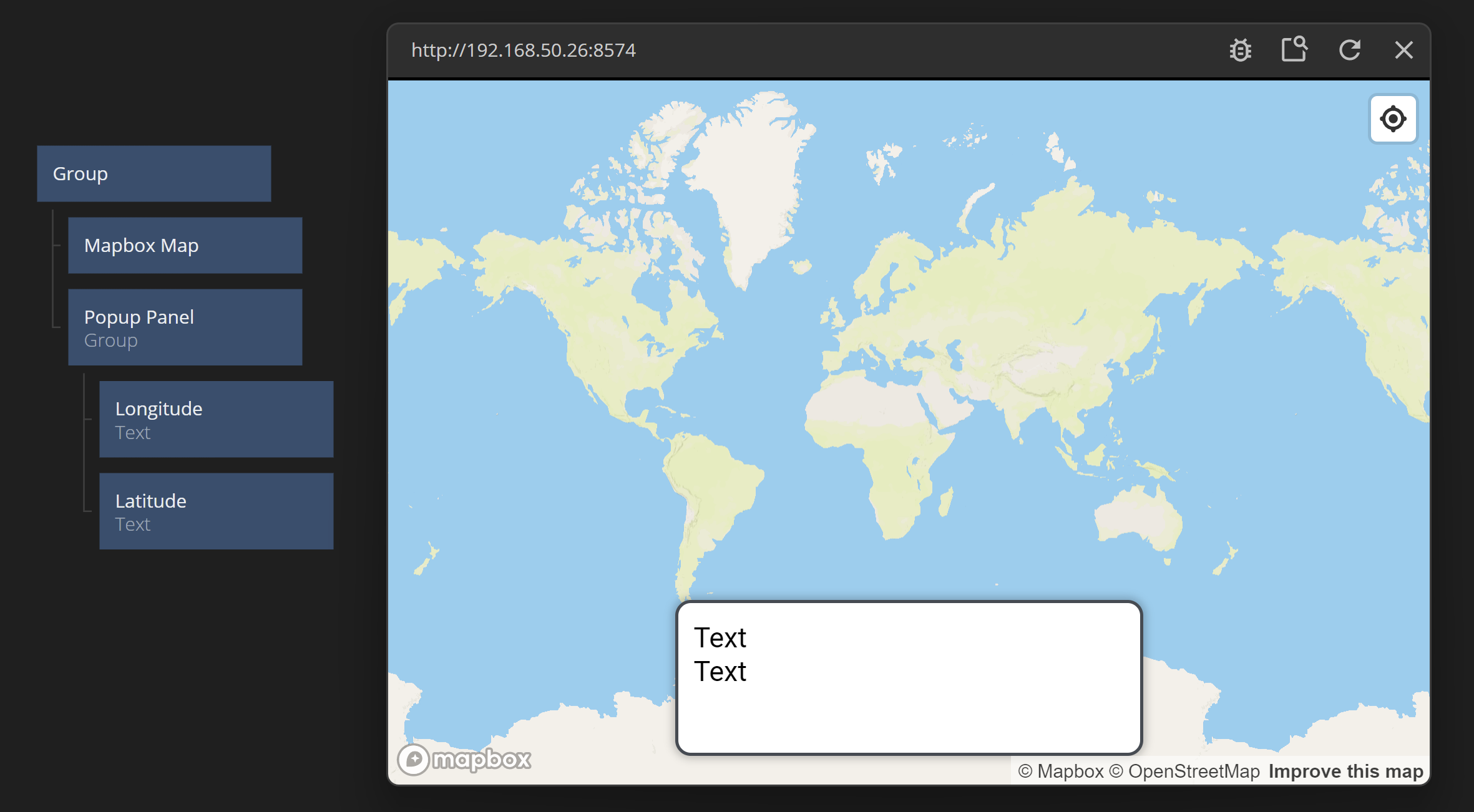Now you should be able to move around and click on the map, showing and hiding the panel printing the longitude and latitude.