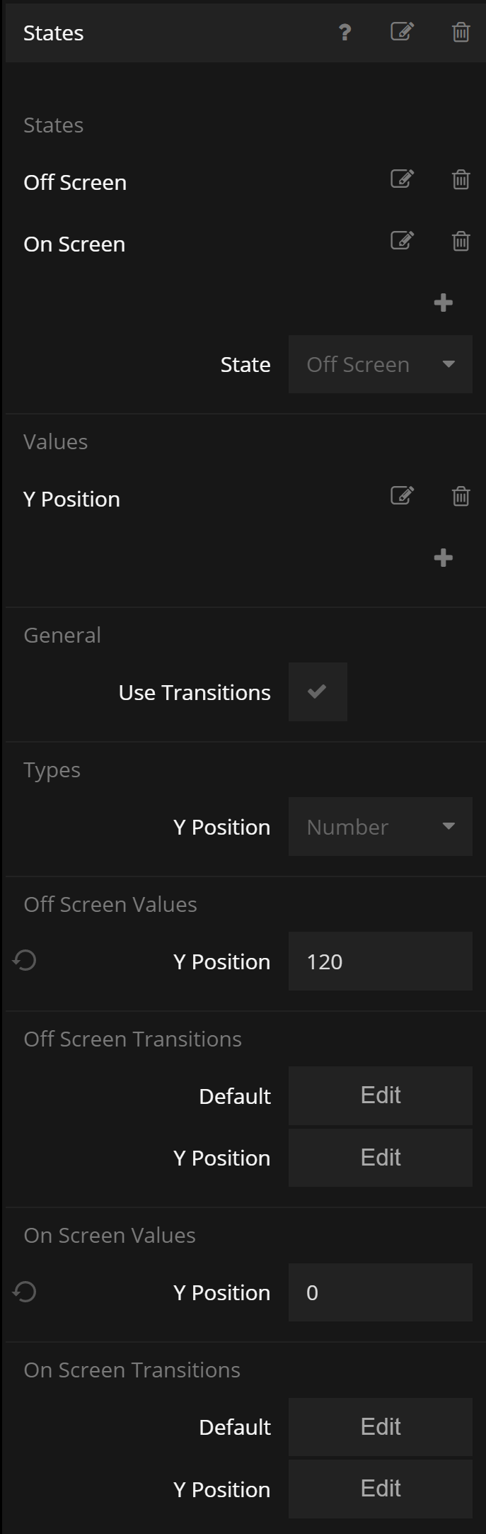 First add a States node that will hold the current state of the panel. Add the states "Off Screen" and "On Screen". Create a value to control in the state, lets call it "Y Position". This is the value that will control the Y position of the panel. It will be 120 when the panel is "Off Screen" (i.e. it will be below the screen). Then it will be 0 when the panel is "On Screen", i.e. it will be back at the bottom of the screen.
