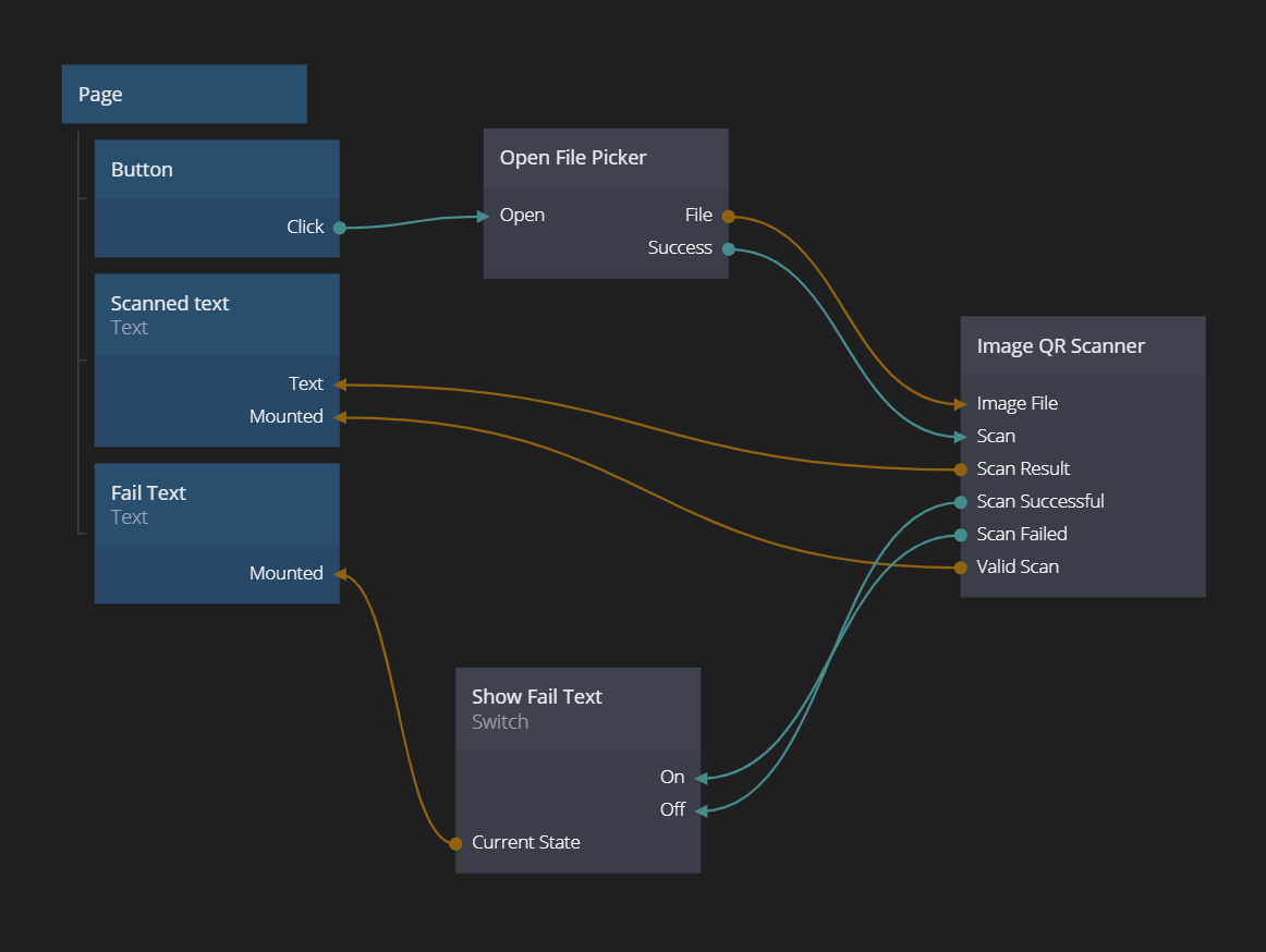 The Image QR Scanner node is used to scane an image for a QR code. It's typically used in conjunction with the Open File Picker node, to allow the user to upload a file.