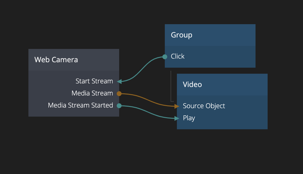 The Web Camera node gets the video stream of a target device’s camera (mobile camera or computer web camera). The Web Camera is used together with the Video node to display the camera stream. See the image below for how to hook it up.
