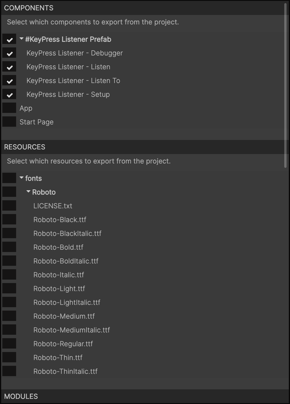 プリファブがテストされ、公開の準備ができたら、zipファイルとしてエクスポートする必要があります。これを行う最良の方法は、プリファブのプロジェクトを開いてCtrl/Cmd + Shift + Eを押すことです。これにより、エクスポートポップアップが表示されます: