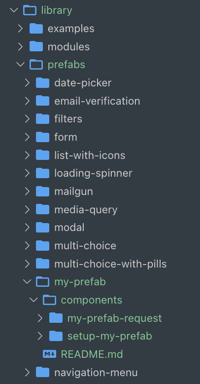 /library/prefabs/:プリファブのドキュメントが置かれる場所です。/static/library/prefabs/:プリファブのドキュメントのアセットが置かれる場所、例えば画像やエクスポートされたzipファイルなど。/static/library/prefabs/index.json:ノードピッカーでプリファブを利用可能にするためにプリファブをリンクする場所です。sidebarsLibrary.js:プリファブのドキュメントのサイドバーメニューを設定する場所です。